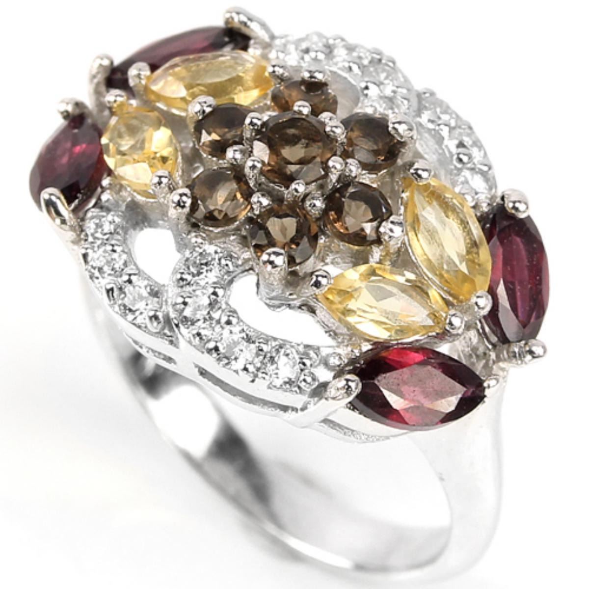 NATURAL SMOKY QUARTZ, CITRINE, GARNET CZ 925SILVER RING 14K WHITE GOLD COATING...size 7; STONE SHAPEROUND MARQUISE PORTUGESE CUTSTONE DIMENSION6 X 3 MM. , 5 X 2.5 MM. , 3 MM. 2.2 MM.MAIN STONE WEIGHT1.78 CARATCOLORMULTI COLORCLARITYIF - VVSLUSTERENCHANTINGTREATMENTUNHEATEDORIGIN OF STONEBRAZIL CAMBODIAHARDNESS7.0 - 7.5OTHERFACE OF RING 20 X 15 MM. WHITE CUBIC ZIRCONIA 1.5 MM. TOTAL 5.55 G.