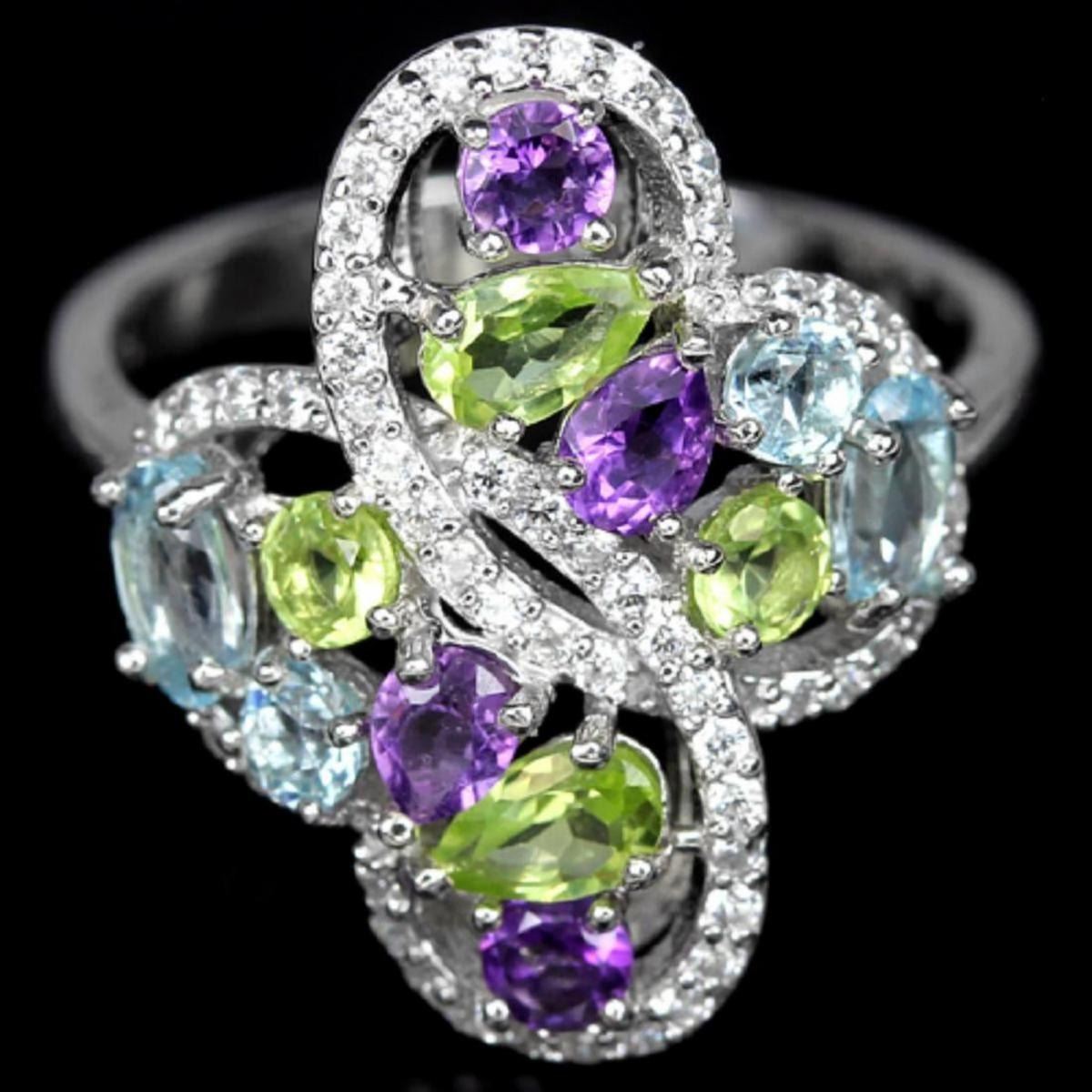 GENUINE AMETHYST PERIDOT TOPAZ & CZ 925 SILVER RING 14K WHITE GOLD COATING ...size 8...can be resized...STONE SHAPEMIXED SHAPESTONE DIMENSION5 X 3 MM. , 4 X 3 MM. & 3 MM.ITEM WEIGHT4.3 GRAMCOLORMULTI COLORCLARITYIF - VVSLUSTERDAZZLINGTREATMENTUNHEATED & IRRADIATIONORIGIN OF STONEBRAZIL, ASIA & AFRICAHARDNESS6.5 - 8.0OTHERFACE OF RING 21 X 17 MM. WHITE CUBIC ZIRCONIA 1 MM.