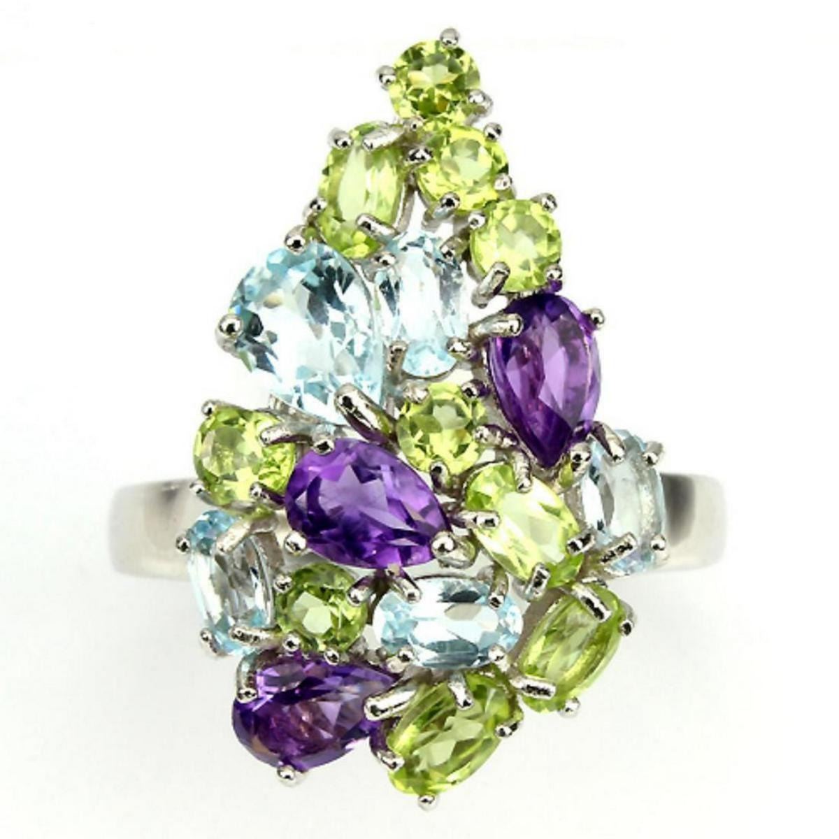 AMETHYST, PERIDOT SKY BLUE TOPAZ (NATURAL) 14K WHITE GOLD COATING 925 SILVER RING;UNIT OF ITEM (S):1 PIECE;WEIGHT (CT.):27.91 CT. (total weight of silver + stone);DIMENSION:* STONE 3.0 TO 7.0 X 5.0 MM. * RING SIZE 8.5 * FACE RING 26.0 X 17.0 MM.;SHAPE/CUT:PEAR OVAL FACET;COLOR:TOP FANCY COLORSCLARITY/GRADE:IF TO VVSLUSTER:RAVISHINGTREATMENT:UNHEATED HEATEDORIGIN:BRAZIL, PAKISTAN AFRICAHARDNESS:6.5 - 8.0