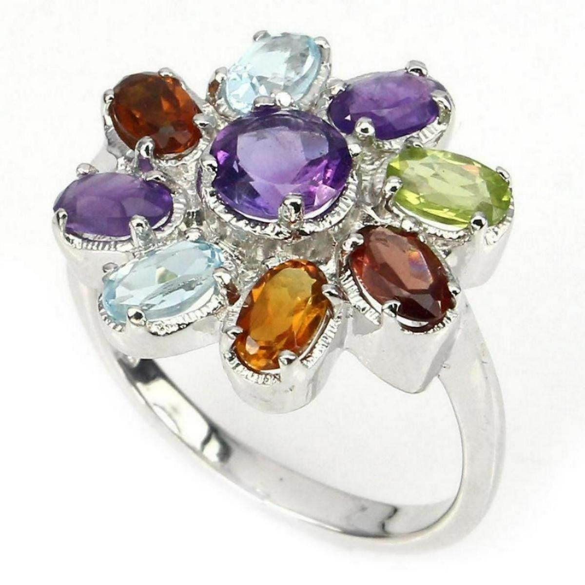 925 STERLING SILVER.... PLATE -14K WHITE GOLD; RING SIZE - 7(Resizeable); MAIN STONE -AMETHYST; OTHER GEMS -CITRINE,MOZAMBIQUE GARNET,PERIDOT,SKY BLUE TOPAZ; TOTAL WEIGHT 27.72 CT (TOTAL WEIGHT OF SILVER + STONE) DIMENSION * STONE 5.0 TO 5.0 X 3.0 MM. * FACE RING 18.0 X 17.0 MM. MAIN STONE SHAPE -ROUND CUT; MAIN STONE COLOR -TOP INTENSE PURPLE; CLARITY/GRADE IF TO VVS; LUSTER -ELEGANT-; TREATMENT -UNHEATED; ORIGIN -URUGURY-; HARDNESS -6.5 - 8.0
