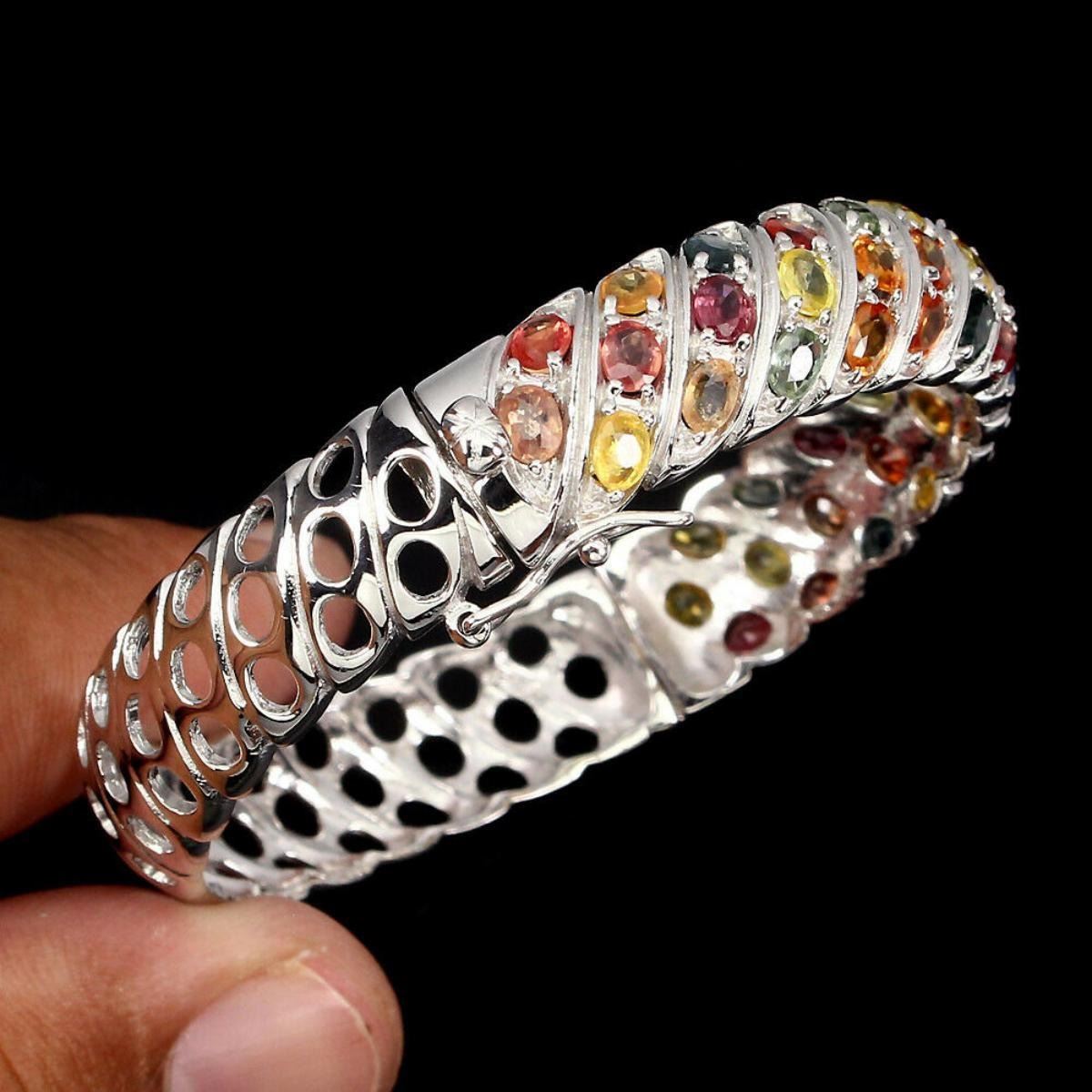 925 STERLING SILVER;PLATE---14K WHITE GOLD;MAIN STONE-SAPPHIRE;TOTAL WEIGHT------111.10 CT (TOTAL WEIGHT OF SILVER + STONE)DIMENSION* STONE 4.0 X 3.0 MM. * DIAMETER 1.9 X 1.8 INCHES. * FACE BANGLE 59.0 X 12.0 MM.;MAIN STONE SHAPEOVAL CUT;MAIN STONE COLORMULTI-COLOR;CLARITY/GRADE--IF TO VVS;LUSTERMESMERIZING;TREATMENT-HEATED;ORIGIN- AFRICA;HARDNESS-9;