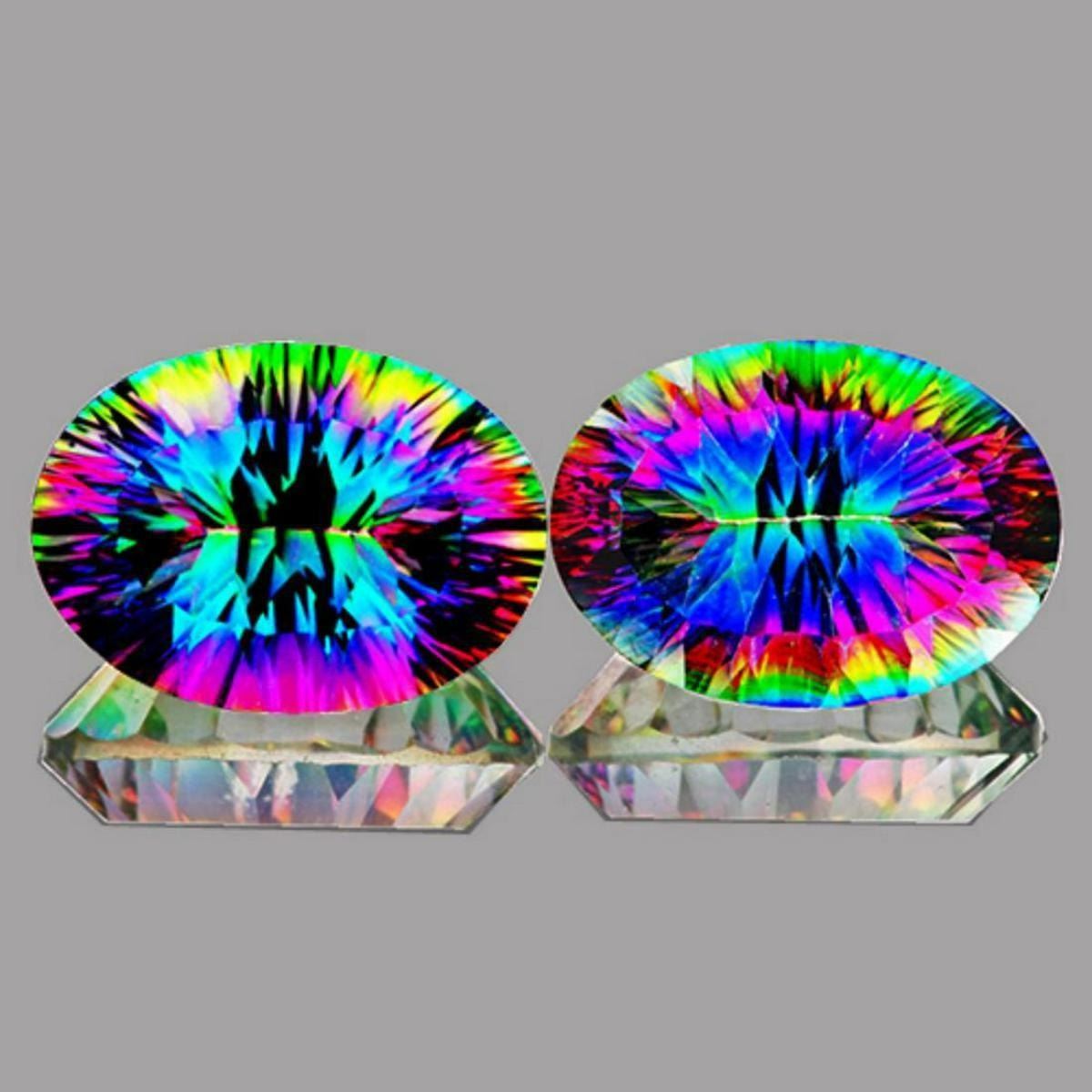 Natural Quartz WEIGHT : 21.01 cts SHAPE : Oval (Concave Cut) SIZE ( L x W x D ) : 18 x 13 mm QUANTITY : 2 pieces (Perfectly Matched Pair) COLOR : Intense AAA Rainbow Multi Color CLARITY : Flawless-VVS1 ORIGIN : Africa HARDNESS : 7 LUSTER : Excellent!!!