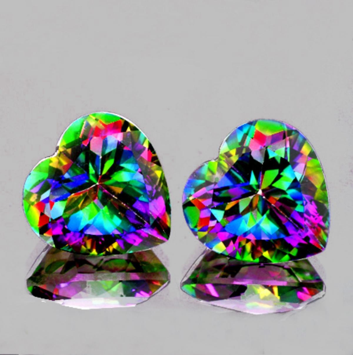 Natural Topaz WEIGHT : 3.18 cts; SHAPE : Heart; SIZE ( L x W x D ) : 7.00 mm; QUANTITY : 2 pieces (Perfectly Matched Pair) COLOR : Mystic Best AAA Color; CLARITY : Flawless-VVS1 AAA Grade; ORIGIN : Africa; HARDNESS : 8;; LUSTER : Excellent!!! TREATMENT : Treated