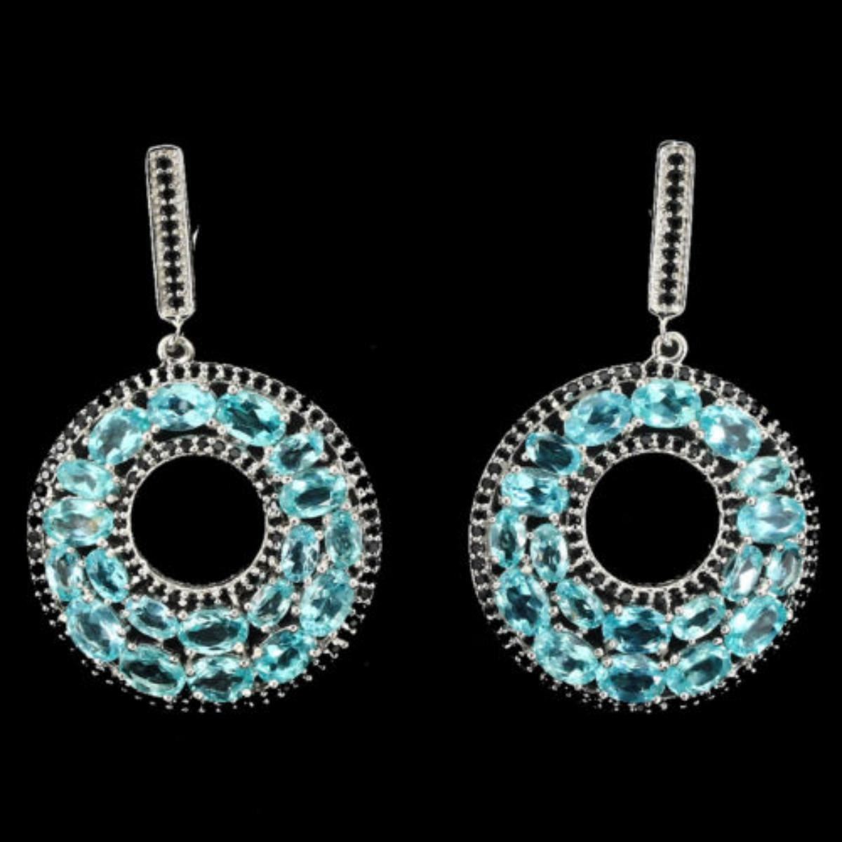 925 STERLING SILVER; PLATE -14K WHITE GOLD; MAIN STONE -APATITE- OTHER GEMS -SPINEL- TOTAL WEIGHT -76.65 CT (TOTAL WEIGHT OF SILVER + STONE) DIMENSION * STONE 1.0 TO 6.0 X 4.0 MM. * FACE EARRINGS 50.0 X 31.0 MM. MAIN STONE SHAPE OVAL CUT MAIN STONE COLOR TOP NEON BLUE CLARITY/GRADE IF TO VVS LUSTER PRECIOUS HARDNESS 5.0