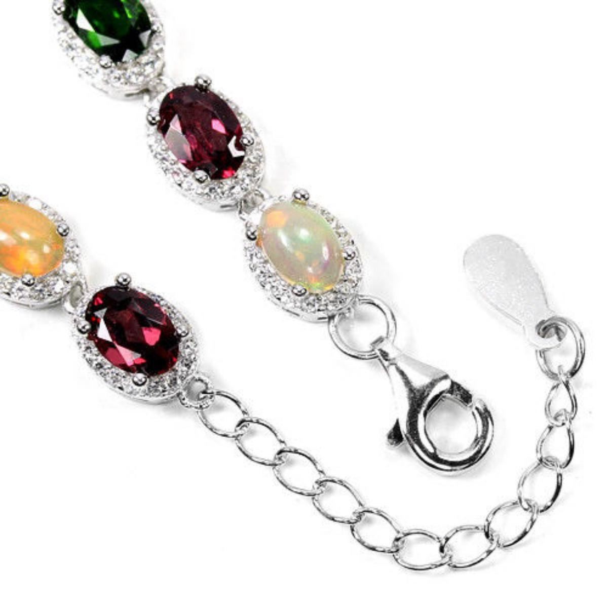 REAL OPAL RHODOLITE APATITE TOPAZ CZ 925 SILVER BRACELET 14K WHITE GOLD COATING; LENGTH OF ITEM (Inch.)7.75;ITEM QUANTITY1STONE SHAPEOVAL CABOCHON CUT & OVAL PORTUGUESE CUTSTONE DIMENSION6 X 4 MM.ITEM WEIGHT11.09 GRAMCOLORMULTI COLORCLARITYTRANSLUCENT & IF-VVSLUSTERALLURINGTREATMENTUNHEATED & IRRADIATIONORIGIN OF STONEAFRICA & BRAZILHARDNESS5.0 - 8.0OTHERWHITE CUBIC ZIRCONIA 1 MM.