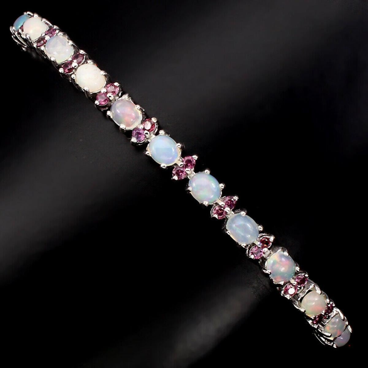 925 STERLING SILVER;PLATE....14K WHITE GOLD;LENGTH (INCHES)8.5;MAIN STONE-FIRE OPAL;OTHER GEMS-RHODOLITE GARNET;TOTAL WEIGHT-60.86 CT (TOTAL WEIGHT OF SILVER + STONE)DIMENSION* STONE 2.0 TO 5.0 X 4.0 MM. * FACE BRACE 185.0 X 4.0LET MM.MAIN STONE SHAPE-OVAL CABOCHON;MAIN STONE COLOR-RAINBOW FULL FLASH;CLARITY/GRADE-IF;LUSTER-ELEGANT;TREATMENT-UNHEATED;ORIGIN-ETHIOPIA;