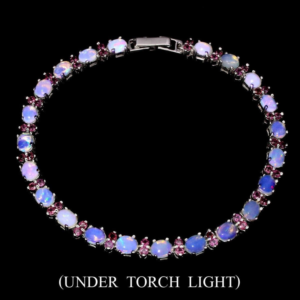925 STERLING SILVER;PLATE....14K WHITE GOLD;LENGTH (INCHES)8.5;MAIN STONE-FIRE OPAL;OTHER GEMS-RHODOLITE GARNET;TOTAL WEIGHT-60.86 CT (TOTAL WEIGHT OF SILVER + STONE)DIMENSION* STONE 2.0 TO 5.0 X 4.0 MM. * FACE BRACE 185.0 X 4.0LET MM.MAIN STONE SHAPE-OVAL CABOCHON;MAIN STONE COLOR-RAINBOW FULL FLASH;CLARITY/GRADE-IF;LUSTER-ELEGANT;TREATMENT-UNHEATED;ORIGIN-ETHIOPIA;