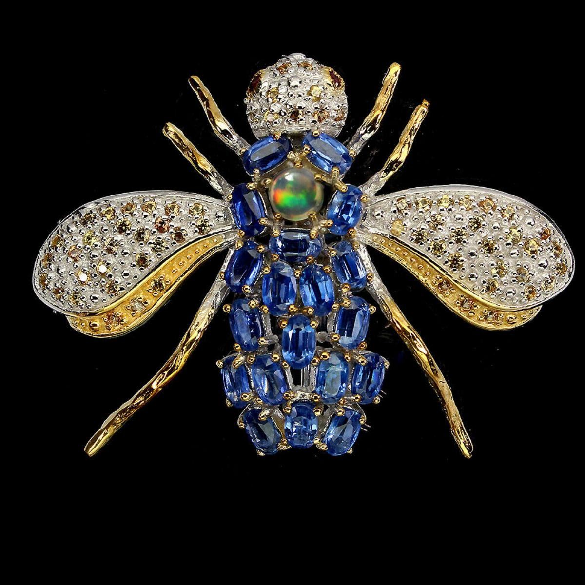 925 STERLING SILVER;PLATE-2-TONE WHITE & YELLOW 14K GOLD;MAIN STONE-opal, sapphire, KYANITE;OTHER GEMS-FIRE OPAL, RHODOLITE GARNET, SAPPHIRE;TOTAL WEIGHT-11.96 GRAM (TOTAL WEIGHT OF SILVER + STONE)DIMENSION-* STONE 1.0 TO 5.0 X 3.0 MM. * FACE BROOCH 52.0 X 38.0 MM.MAIN STONE SHAPE-OVAL CUT;MAIN STONE COLOR-TOP CORNFLOWER BLUE;TREATMENT-UNHEATED;