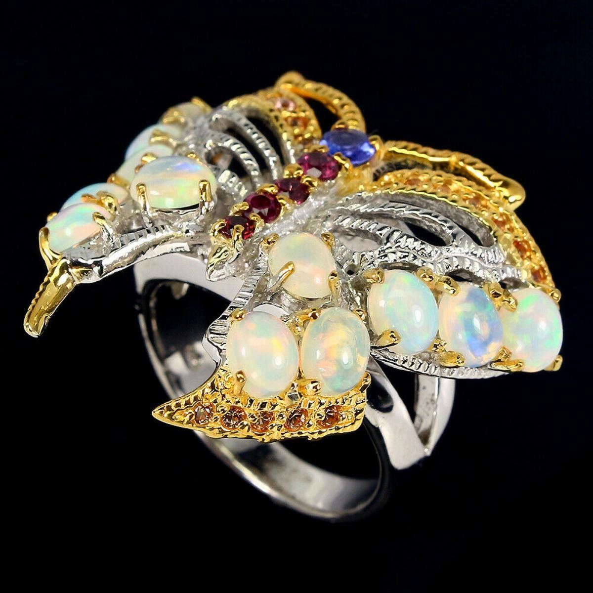 925 STERLING SILVER;PLATE-2-TONE WHITE & YELLOW 14K GOLD;RING SIZE(resizeable)8;MAIN STONE-FIRE OPAL;OTHER GEMS-RHODOLITE GARNET, SAPPHIRE, TANZANITE;TOTAL WEIGHT-13.06 GRAM (TOTAL WEIGHT OF SILVER + STONE)DIMENSION-* STONE 1.5 TO X 5.0 X 4.0 MM. * RING SIZE 8.0 * FACE RING- 31.0 X 29.0 MM.;MAIN STONE SHAPE-OVAL CABOCHON;MAIN STONE COLOR-RAINBOW FULL FLASH;TREATMENT-UNHEATED;ORIGIN-ETHIOPIA;HARDNESS-5.5 - 6.5;