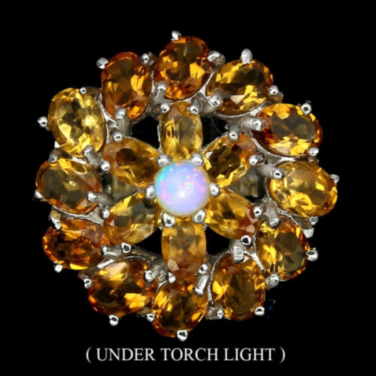 925 STERLING SILVER;PLATE-14K WHITE GOLD;RING SIZE/LENGTH (INCHES)8;MAIN STONEFIRE OPAL;OTHER GEMSCITRINE;TOTAL WEIGHT73.53 CT (TOTAL WEIGHT OF SILVER + STONE);DIMENSION* STONE 5.0 TO 7.0 X 5.0 MM. * FACE RING 28.0 MM.;MAIN STONE SHAPEROUND CABOCHON;MAIN STONE COLORMULTI-COLOR;CLARITY/GRADETRANSPARENT;LUSTERFANTASTIC;TREATMENTUNHEATED;ORIGINETHIOPIA;HARDNESS5.5 - 7.0
