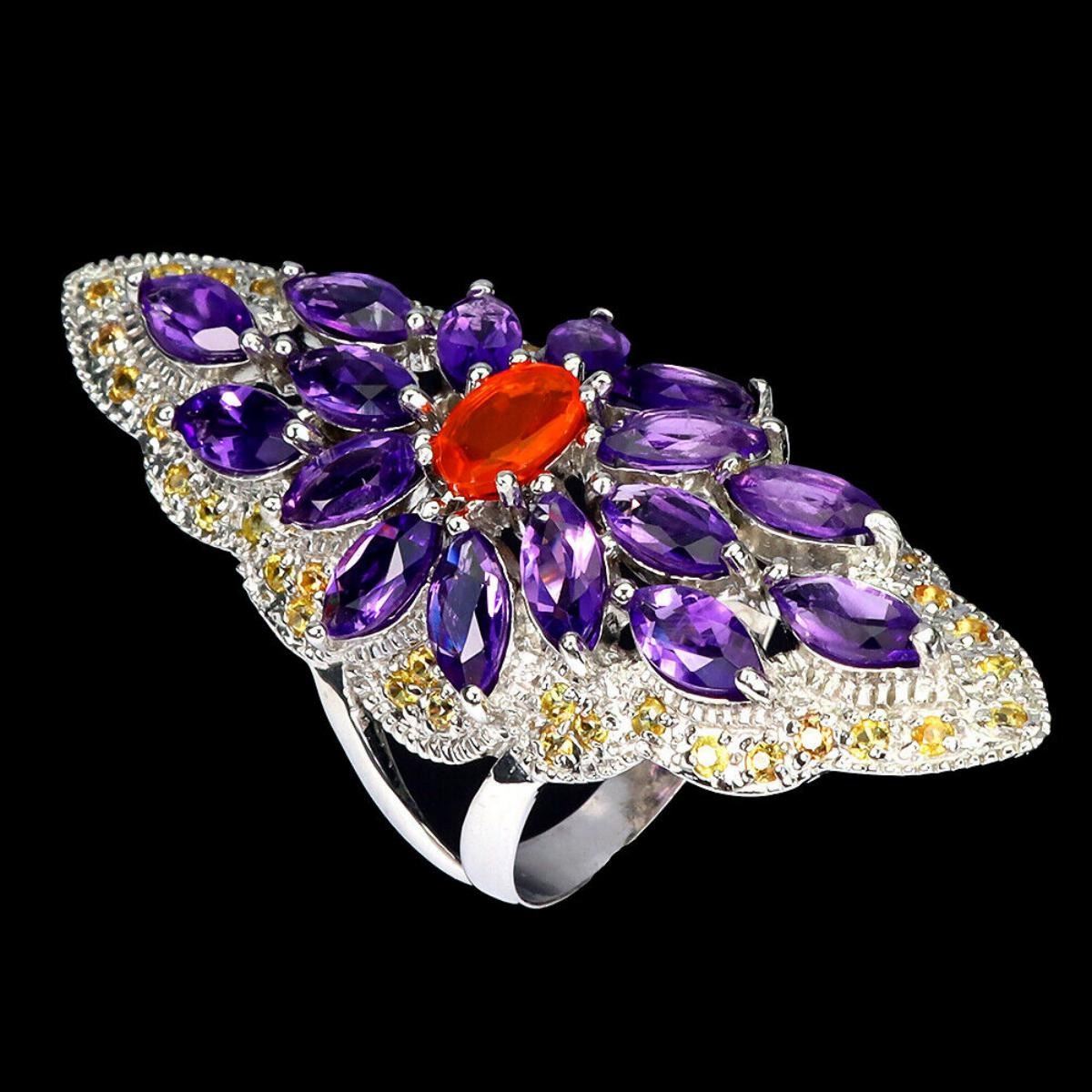 925 STERLING SILVER;PLATE-14K WHITE GOLD;RING SIZE/resizable-9;MAIN STONE-ORANGE OPAL;OTHER GEMS-AMETHYST, SAPPHIRE;TOTAL WEIGHT-10.04 GRAM (TOTAL WEIGHT OF SILVER + STONE)DIMENSION-* STONE 1.5 TO 7.0 X 5.0 MM.;* FACE RING- 52.0 X 20.0 MM.;MAIN STONE SHAPE-OVAL CUT;MAIN STONE COLOR-TOP RICH ORANGE;CLARITY/GRADE-IF;ORIGIN-MEXICO;HARDNESS-5.5 - 6.5;