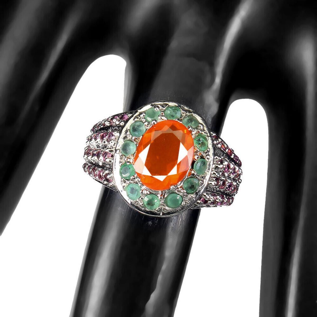 925 STERLING SILVER;PLATE-14K WHITE GOLD;RING SIZE-7(RESIZABLE);MAIN STONE-ORANGE OPAL;OTHER GEMS-EMERALD, RHODOLITE GARNET;TOTAL WEIGHT-5 GRAM (TOTAL WEIGHT OF SILVER + STONE);DIMENSION-* STONE 1.5 TO 9.0 X 7.0 MM.* RING SIZE 7.0* FACE RING 21.0 X 15.0 MM.;MAIN STONE SHAPE-OVAL; MAIN STONE COLOR-ORANGE;CLARITY/GRADE-IF;TREATMENTYES;ORIGIN-MEXICO/Colombia;HARDNESS-5.5 - 6.5;