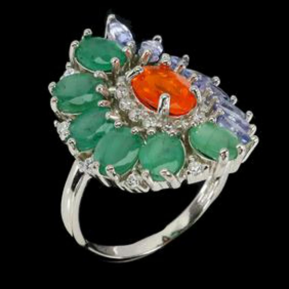 925 STERLING SILVER;PLATE-14K WHITE GOLD;RING SIZE-6(RESIZABLE);MAIN STONE-ORANGE OPAL;OTHER GEMS-EMERALD, TANZANITE;TOTAL WEIGHT-5.09 GRAM (TOTAL WEIGHT OF SILVER + STONE);DIMENSION-* STONE 4.0 X 2.0 TO 7.0 X 5.0 MM. * RING SIZE 6.0 * FACE RING 23.0 X 15.0 MM.;MAIN STONE SHAPE-OVAL;MAIN STONE COLOR- ORANGE;CLARITY/GRADE-IF TO VVS;ORIGIN-ETHIOPIA/COLOMBIA;HARDNESS-5;