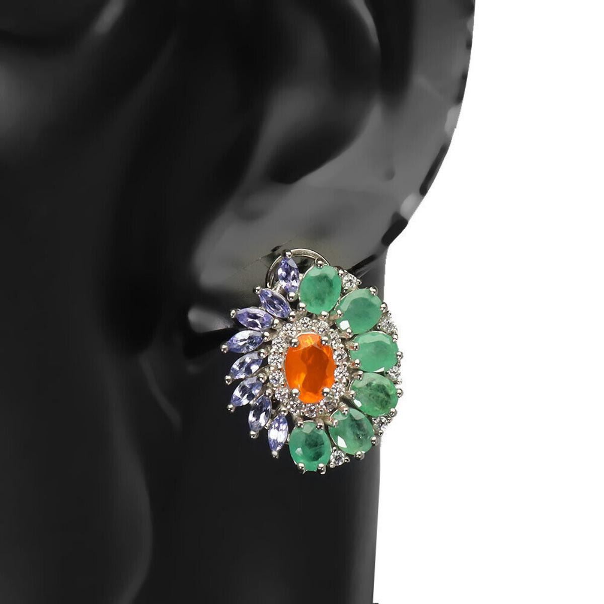 925 STERLING SILVER;PLATE-14K WHITE GOLD;MAIN STONE-ORANGE OPAL;OTHER GEMS -EMERALD, TANZANITE;TOTAL WEIGHT-8.78 GRAM (TOTAL WEIGHT OF SILVER + STONE);DIMENSION-* STONE 4.0 X 2.0 TO 7.0 X 5.0 MM. * FACE EARRINGS 23.0 X 19.0 MM.;MAIN STONE SHAPE-OVAL; MAIN STONE COLOR- ORANGE;CLARITY/GRADE-IF TO VVS;ORIGIN-ETHIOPIA /COLOMBIA;HARDNESS-5;