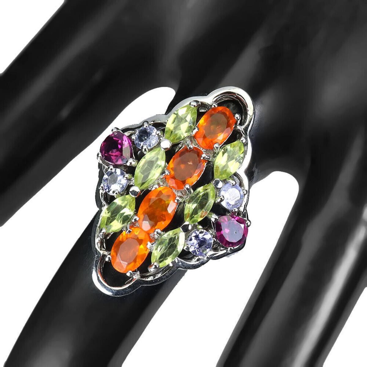 925 STERLING SILVER;PLATE-14K WHITE GOLD;RING SIZE/resizable-8;MAIN STONE-ORANGE OPAL;OTHER GEMS-PERIDOT, RHODOLITE GARNET, TANZANITE;TOTAL WEIGHT-9.24 GRAM (TOTAL WEIGHT OF SILVER + STONE)DIMENSION-* STONE 3.5 TO 6.0 X 4.0 MM. * RING SIZE 8.0 * FACE RING -31.0 X 22.0 MM.;MAIN STONE SHAPE-OVAL CUT;MAIN STONE COLOR--ORANGE;CLARITY/GRADE-IF;TREATMENT-- Yes;ORIGIN-MEXICO;HARDNESS-5;