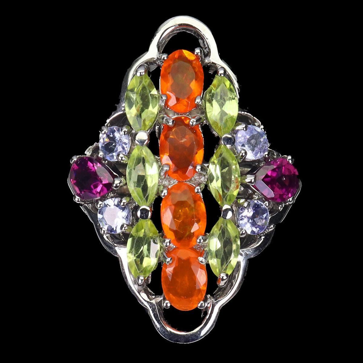 925 STERLING SILVER;PLATE-14K WHITE GOLD;RING SIZE/resizable-8;MAIN STONE-ORANGE OPAL;OTHER GEMS-PERIDOT, RHODOLITE GARNET, TANZANITE;TOTAL WEIGHT-9.24 GRAM (TOTAL WEIGHT OF SILVER + STONE)DIMENSION-* STONE 3.5 TO 6.0 X 4.0 MM. * RING SIZE 8.0 * FACE RING -31.0 X 22.0 MM.;MAIN STONE SHAPE-OVAL CUT;MAIN STONE COLOR--ORANGE;CLARITY/GRADE-IF;TREATMENT-- Yes;ORIGIN-MEXICO;HARDNESS-5;