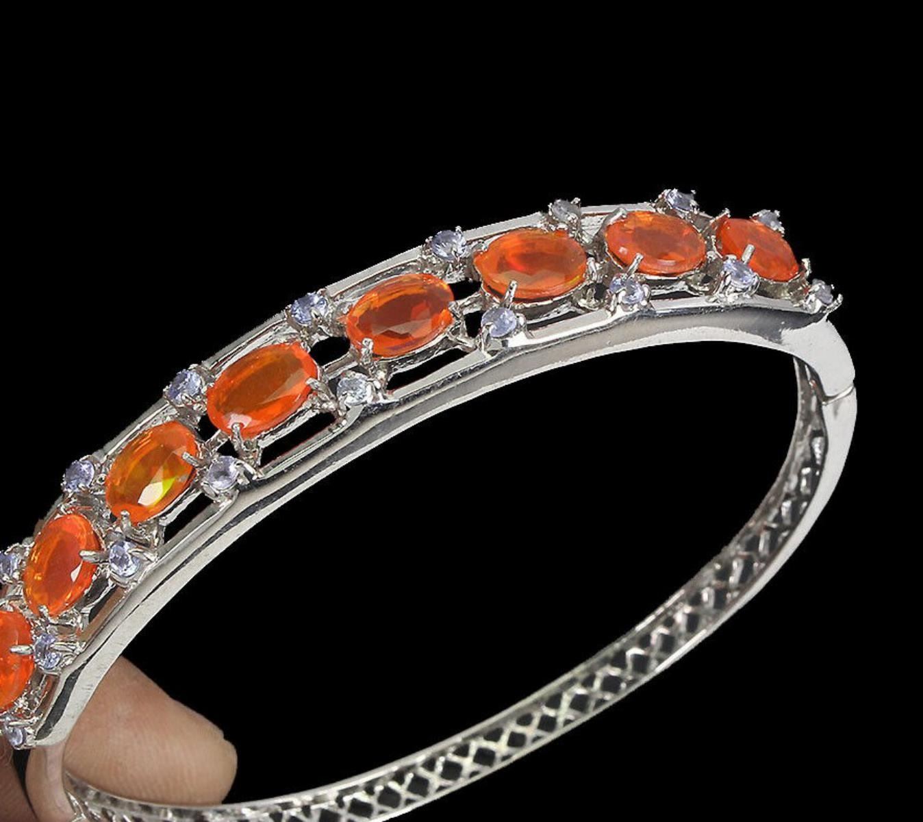 925 STERLING SILVER;PLATE-14K WHITE GOLD;)MAIN STONE-ORANGE OPAL;OTHER GEMS-TANZANITE;TOTAL WEIGHT-15.42 GRAM (TOTAL WEIGHT OF SILVER + STONE)DIMENSION-* STONE 2.0 TO 7.0 X 5.0 MM.;* DIAMETER -2.1 X 1.9 INCHES.;* FACE BANGLE- 62.0 X 11.0 MM.;MAIN STONE SHAPE-OVAL CUT;MAIN STONE COLOR- ORANGE;CLARITY/GRADE-IF;ORIGIN-Ethopia ;HARDNESS-5.5 - 6.5;