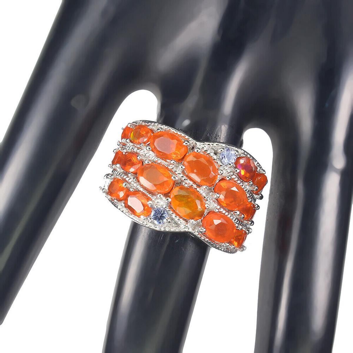 925 STERLING SILVER;PLATE-14K WHITE GOLD;RING SIZE-7.5(RESIZABLE);MAIN STONE-ORANGE OPAL;OTHER GEMS-TANZANITE;TOTAL WEIGHT-8.96 GRAM (TOTAL WEIGHT OF SILVER + STONE);DIMENSION-* STONE 2.5 TO 6.0 X 4.0 MM. * RING SIZE 7.5 * FACE RING 25.0 X 16.0 MM.;MAIN STONE SHAPE-OVAL; MAIN STONE COLOR-ORANGE;CLARITY/GRADE-IF;TREATMENT-YES;ORIGIN-MEXICO;HARDNESS-5.5 - 6.5;