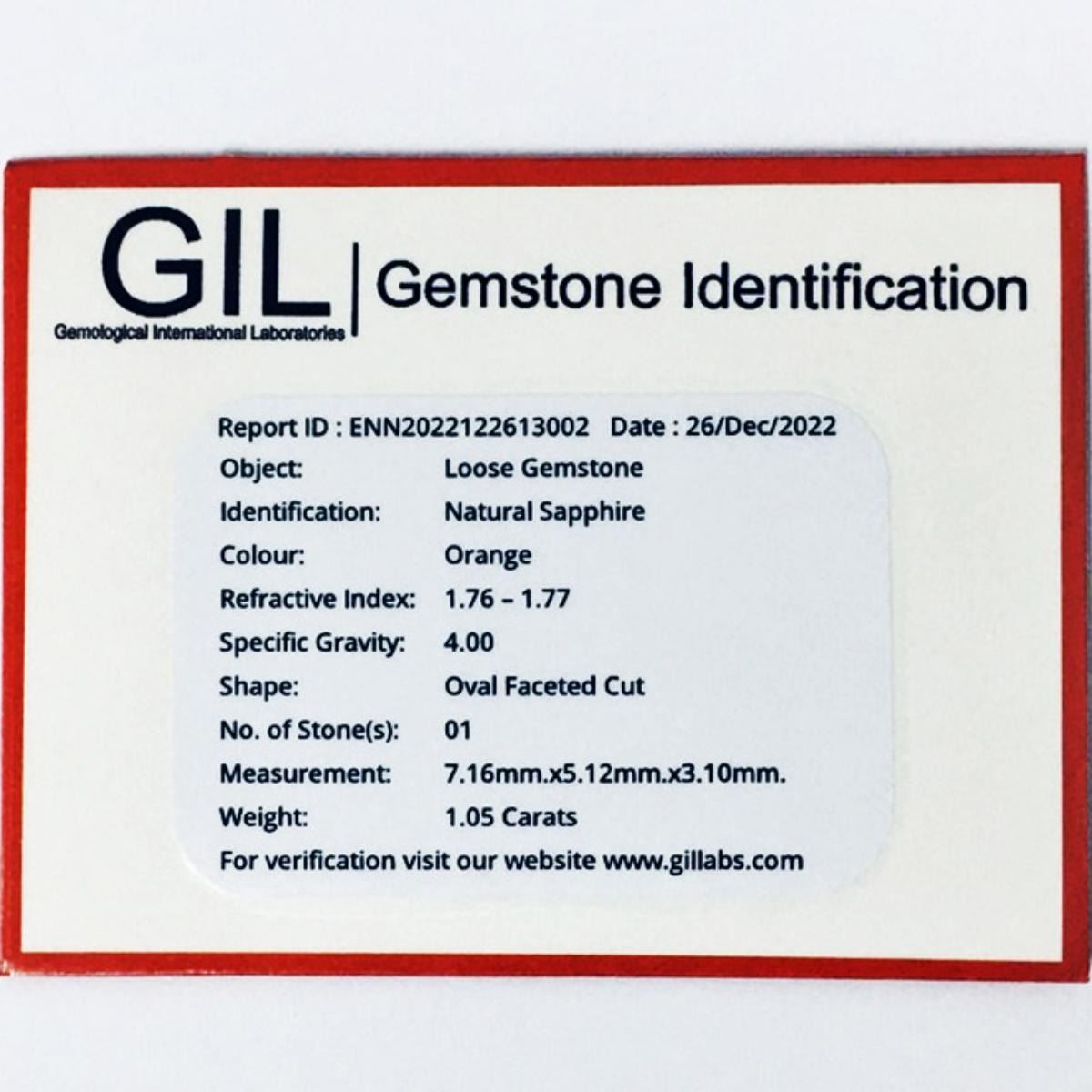 Natural Sapphire; WEIGHT : 1.05 cts; SHAPE : Oval; SIZE ( L x W x D ) : 7.16 x 5.12 x 3.10 mm; QUANTITY : 1 piece; COLOR : Intense Orange Red ; AAA Color; CLARITY : Flawless-VVS ; AAA Grade; ORIGIN : Ceylon; HARDNESS : 9; LUSTER : AAA Fire!!! TREATMENT : Heated; Certified ;