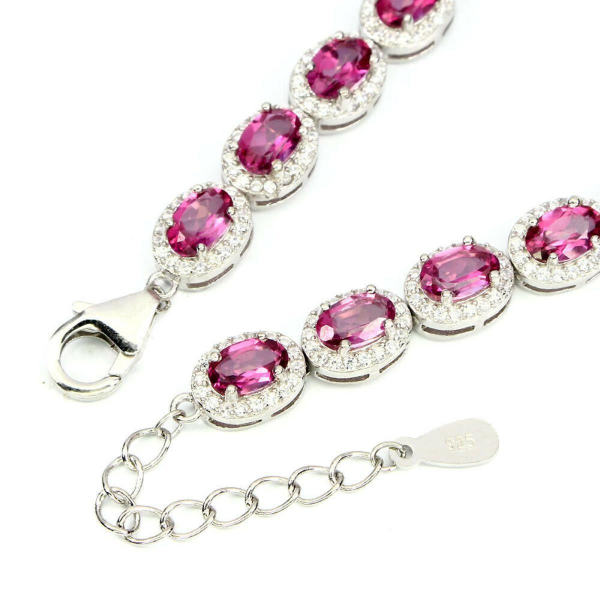 925 STERLING SILVER;PLATE-14K WHITE GOLD;LENGTH (INCHES)7.5;MAIN STONE-PINK TOPAZ;OTHER GEMS-CUBIC ZIRCONIA;TOTAL WEIGHT-66.86 CT (TOTAL WEIGHT OF SILVER + STONE)DIMENSION* STONE 6.0 X 4.0 MM. * CZ 1.0 MM. * FACE BRACELET 176.0 X 7.0 MM.;MAIN STONE SHAPE-OVAL CUT;MAIN STONE COLOR-AAA RICH PINK;CLARITY/GRADE-IF;TREATMENT-HEATED;ORIGIN-AFRICA;HARDNESS-8