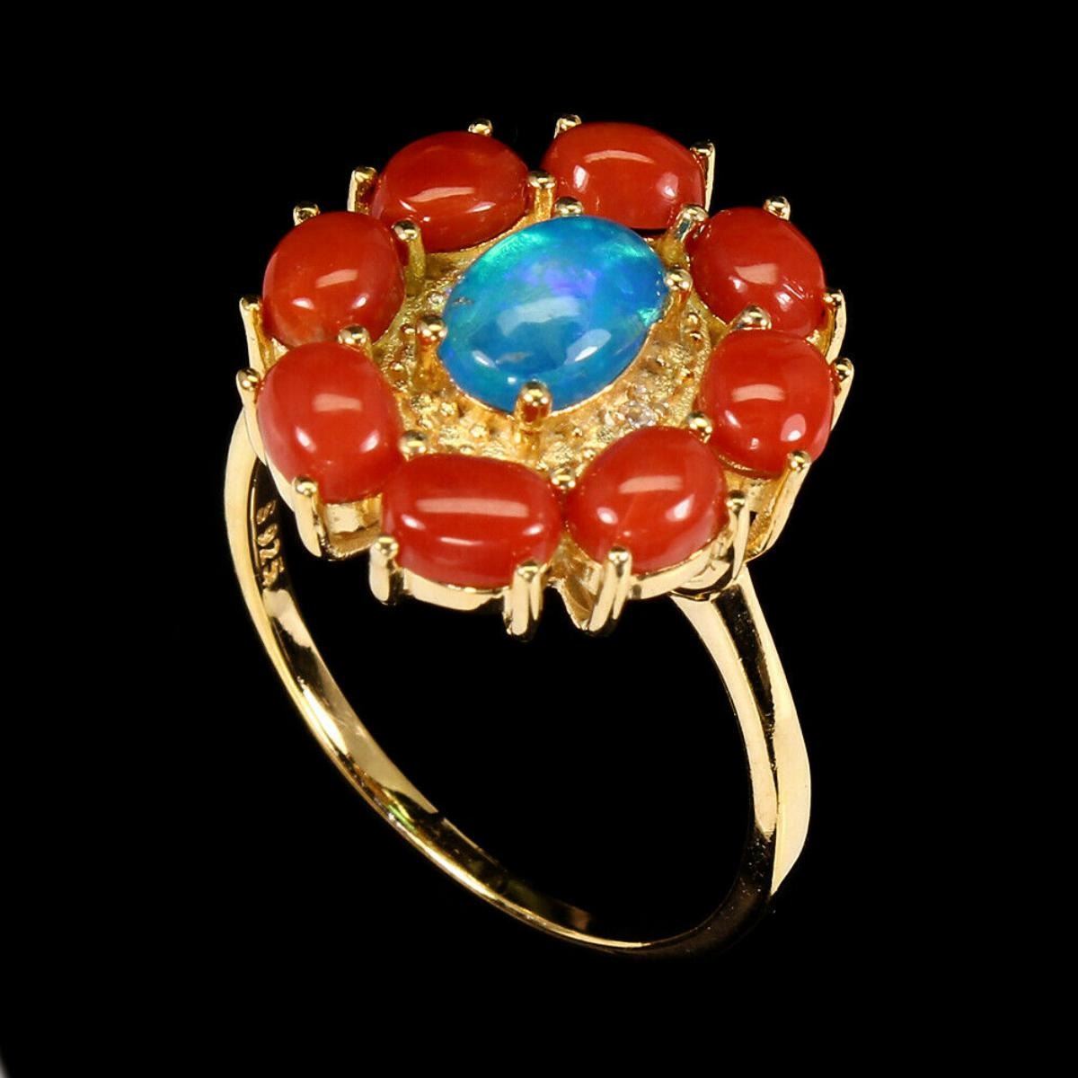 925 STERLING SILVER;PLATE-14K YELLOW GOLD;RING SIZE/LENGTH -7.5 (Resizeable);MAIN STONE-BLUE FIRE OPAL;OTHER GEMS-CORAL,;TOTAL WEIGHT-4.2 GRAM (TOTAL WEIGHT OF SILVER + STONE)DIMENSION* STONE 5.0 X 4.0 TO 7.0 X 5.0 MM. * CZ 1.0 MM. * FACE RING 18.0 X 17.0 MM.MAIN STONE SHAPE-OVAL CABOCHON;MAIN STONE COLOR-TOP RICH BLUE;ORIGIN-ETHIOPIA, ITALY;HARDNESS-3.0 - 6.5