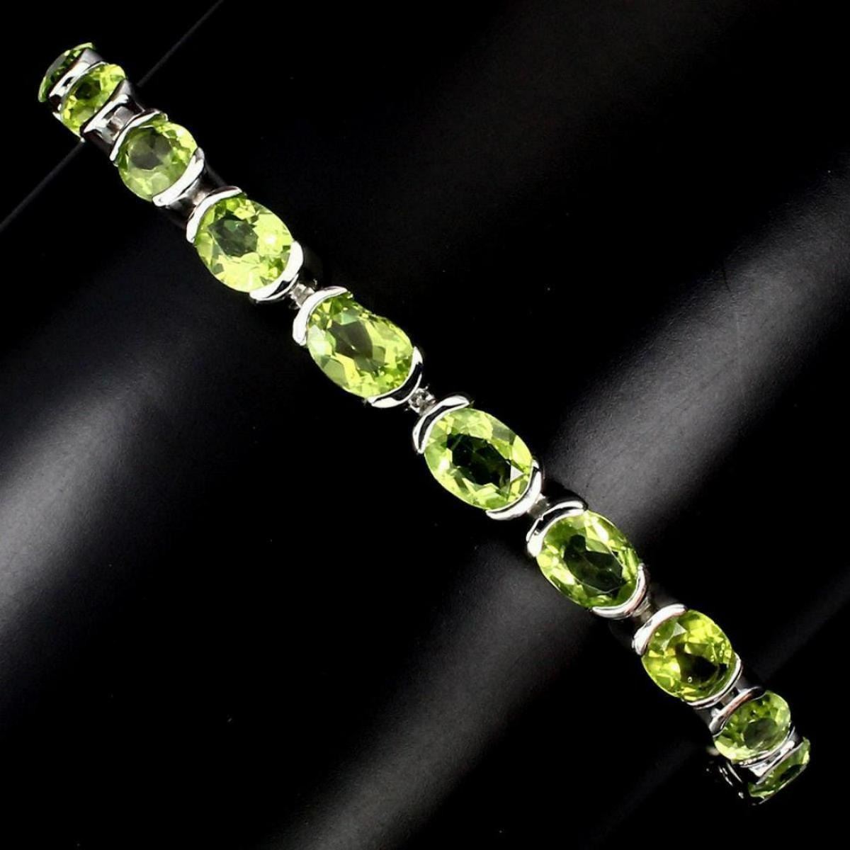 925 STERLING SILVER;PLATE...14K WHITE GOLD;LENGTH (INCHES)7.5.MAIN STONE PERIDOT.TOTAL WEIGHT 77.43 CT (TOTAL WEIGHT OF SILVER + STONE)DIMENSION* STONE 7.0 X 5.0 MM. * FACE BRACELET 175.0 X 5.0 MM..MAIN STONE SHAPE OVAL CUT.MAIN STONE COLORTOP RICH GREEN.CLARITY/GRADE IF TO VVS. TREATMENT UNHEATED.ORIGIN PAKISTAN.HARDNESS 6.5 - 7.0.