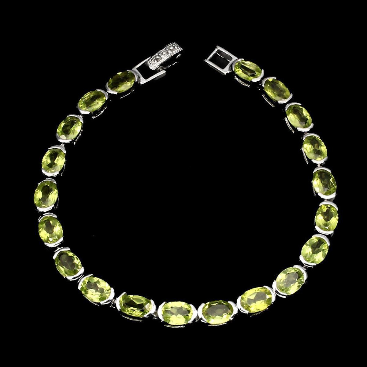 925 STERLING SILVER;PLATE...14K WHITE GOLD;LENGTH (INCHES)7.5.MAIN STONEPERIDOT.OTHER GEMSTOTAL WEIGHT77.43 CT (TOTAL WEIGHT OF SILVER + STONE)DIMENSION* STONE 7.0 X 5.0 MM. * FACE BRACELET 175.0 X 5.0 MM..MAIN STONE SHAPEOVAL CUT.MAIN STONE COLORTOP RICH GREEN.CLARITY/GRADEIF TO VVS.LUSTERFASCINATING.TREATMENTUNHEATED.ORIGINPAKISTAN.HARDNESS6.5 - 7.0.