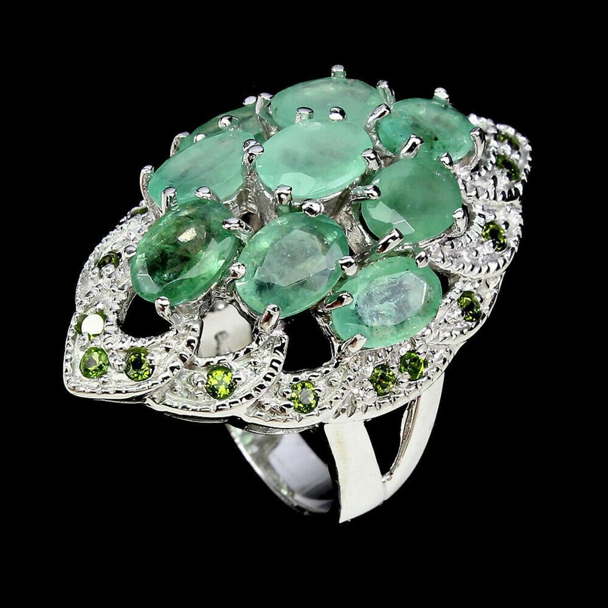 925 STERLING SILVER; PLATE -14K WHITE GOLD; RING SIZE -7.5(resizeable); MAIN STONE -EMERALD; OTHER GEMS -CHROME DIOPSIDE; TOTAL WEIGHT -10.65 GRAM (TOTAL WEIGHT OF SILVER + STONE) DIMENSION * STONE 1.5 TO 7.0 X 5.0 MM. * RING SIZE 7.5 * FACE RING 34.0 X 22.0 MM. MAIN STONE SHAPE -OVAL CUT MAIN STONE COLOR -TOP RICH GREEN; TREATMENT UNHEATED; ORIGIN -BRAZIL; HARDNESS -7.5 - 8.0;