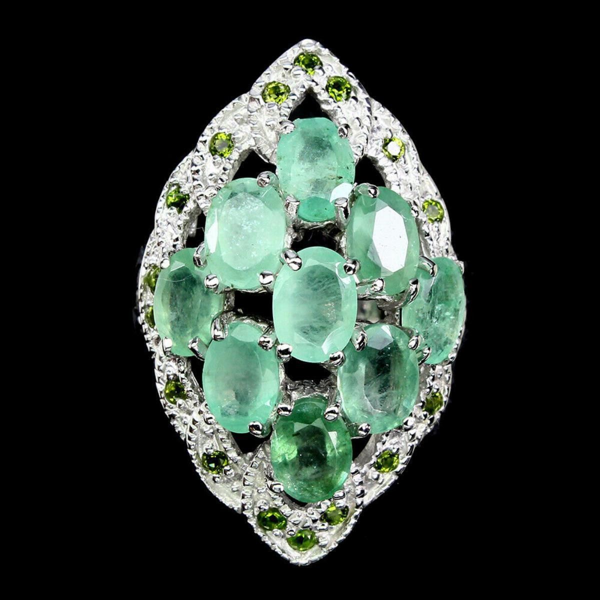 925 STERLING SILVER; PLATE -14K WHITE GOLD; RING SIZE -7.5(resizeable); MAIN STONE -EMERALD; OTHER GEMS -CHROME DIOPSIDE; TOTAL WEIGHT -10.65 GRAM (TOTAL WEIGHT OF SILVER + STONE) DIMENSION * STONE 1.5 TO 7.0 X 5.0 MM. * RING SIZE 7.5 * FACE RING 34.0 X 22.0 MM. MAIN STONE SHAPE -OVAL CUT MAIN STONE COLOR -TOP RICH GREEN; TREATMENT UNHEATED; ORIGIN -BRAZIL; HARDNESS -7.5 - 8.0;