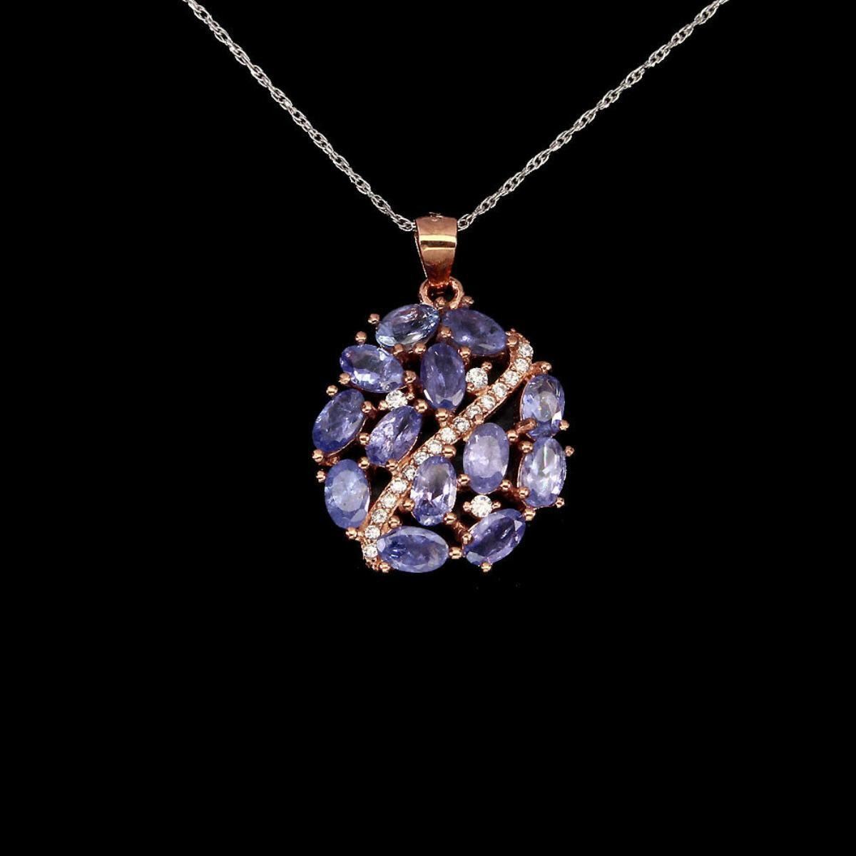 925 STERLING SILVER;PLATE2-TONE WHITE & ROSE 14K GOLD;LENGTH (INCHES)16;MAIN STONETANZANITE;OTHER GEMSCUBIC ZIRCONIA;TOTAL WEIGHT19.92 CT (TOTAL WEIGHT OF SILVER + STONE)DIMENSION* STONE 5.0 X 3.0 MM. * CZ 1.0 TO 1.5 MM. * STONES PART LENGTH 27.0 X 18.0 MM.;MAIN STONE SHAPE-OVAL CUT;MAIN STONE COLORTOP RICH BLUE VIOLET;CLARITY/GRADE- VVS;TREATMENT-UNHEATED;ORIGIN-TANZANIA - AFRICA;HARDNESS7.0 - 7.5;
