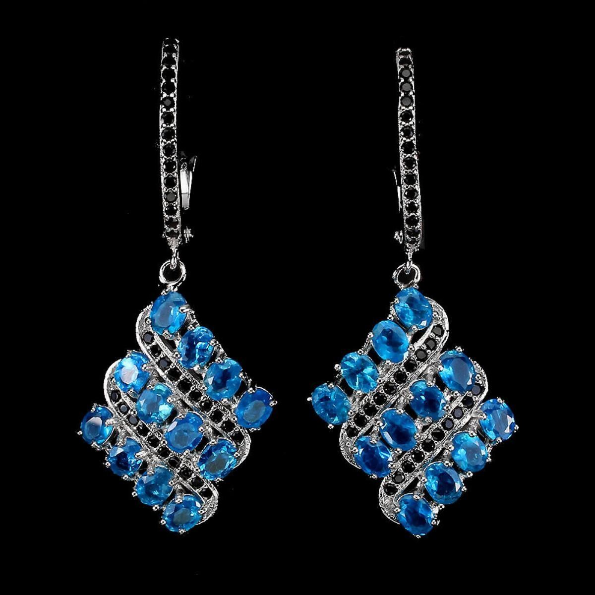 925 STERLING SILVER;PLATE-14K WHITE GOLD;MAIN STONE-APATITE;OTHER GEMS-BLACK SPINEL;TOTAL WEIGHT-7.31 GRAM (TOTAL WEIGHT OF SILVER + STONE);DIMENSION-* STONE 1.0 TO 4.0 X 3.0 MM. * FACE EARRINGS 44.0 X 20.0 MM.;MAIN STONE SHAPE-OVAL; MAIN STONE COLOR- PARAIBA BLUE;CLARITY/GRADE-IF TO VVS;TREATMENT-UNHEATED;ORIGIN-BRAZIL;HARDNESS-5;