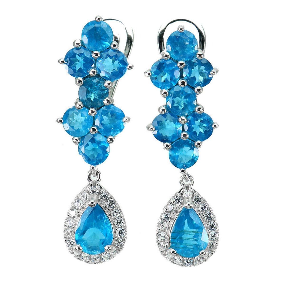 25 STERLING SILVER;PLATE-14K WHITE GOLD;MAIN STONE-APATITE;TOTAL WEIGHT-6.75 GRAM (TOTAL WEIGHT OF SILVER + STONE);DIMENSION-* STONE 4.0 TO 7.0 X 5.0 MM.* FACE EARRINGS 32.0 X 10.0 MM.;MAIN STONE SHAPE-PEAR;MAIN STONE COLOR- PARAIBA BLUE;CLARITY/GRADE-IF TO VVS;TREATMENT-UNHEATED;ORIGIN-AFRICA;HARDNESS-5;
