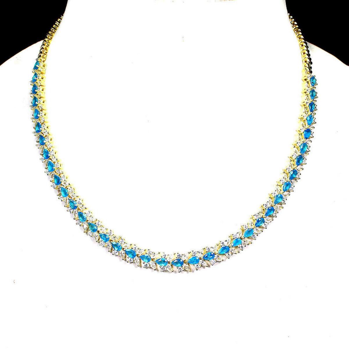 925 STERLING SILVER;PLATE-14K YELLOW GOLD;LENGTH (INCHES)17;MAIN STONE-APATITE;TOTAL WEIGHT-32.55 GRAM (TOTAL WEIGHT OF SILVER + STONE)DIMENSION-* STONE 5.0 X 3.0 MM. * CZ 2.0 TO 4.0 X 2.0 MM. * TOTAL LENGTH -17.0 INCHES. * STONES PART LENGTH 240.0 X 8.0 MM.MAIN STONE SHAPE-PEAR CUTMAIN STONE COLOR- NEON BLUE;CLARITY/GRADE-IF TO VVS;;TREATMENT-UNHEATED;ORIGIN-Brazil;HARDNESS-5;