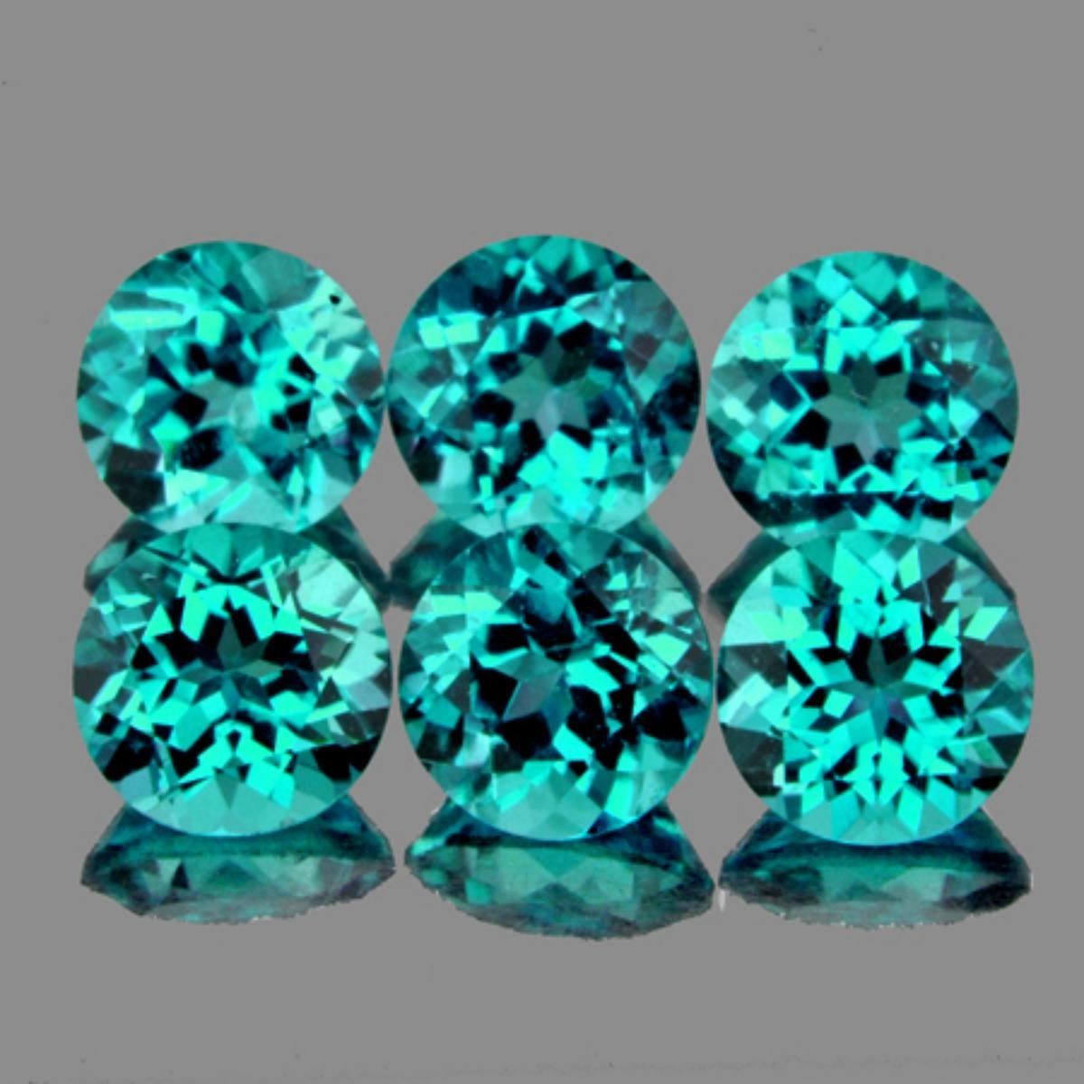 Natural Apatite ..... SHAPE : Round; SIZE ( L x W x D ) : 4.50 mm; QUANTITY : 6 pieces(Perfectly Match Set) COLOR : Paraiba Blue/Green... AAA COLOR; CLARITY : VVS; ORIGIN : Madagascar; HARDNESS : 5; LUSTER : Excellent!!! TREATMENT : 100% Natural Unheated