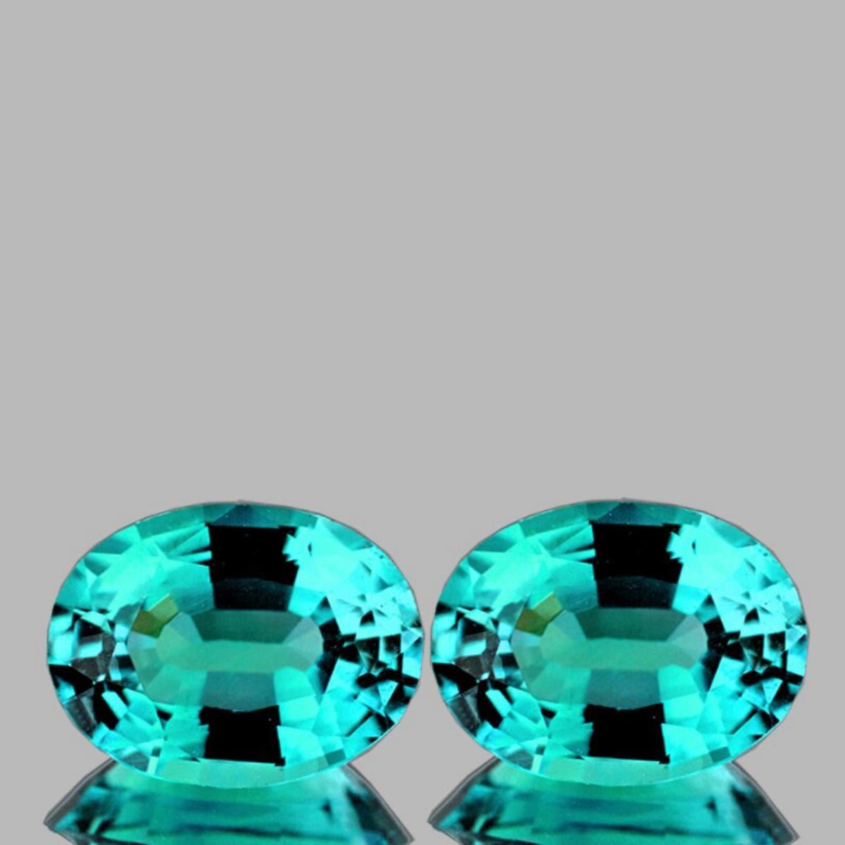 Natural Apatite; WEIGHT : 3.23 cts; SHAPE : Oval; SIZE ( L x W x D ) : 8.50 x 6.50 mm; QUANTITY : 2 pieces (Perfect Matching Pair) COLOR : Paraiba Green Blue AAA Color; CLARITY : 1 piece= Flawless-VVS;: 1 piece=VVS; AAA Grade; ORIGIN : Madagascar; HARDNESS : 5; LUSTER : Excellent!!! TREATMENT : 100% Natural Unheated;