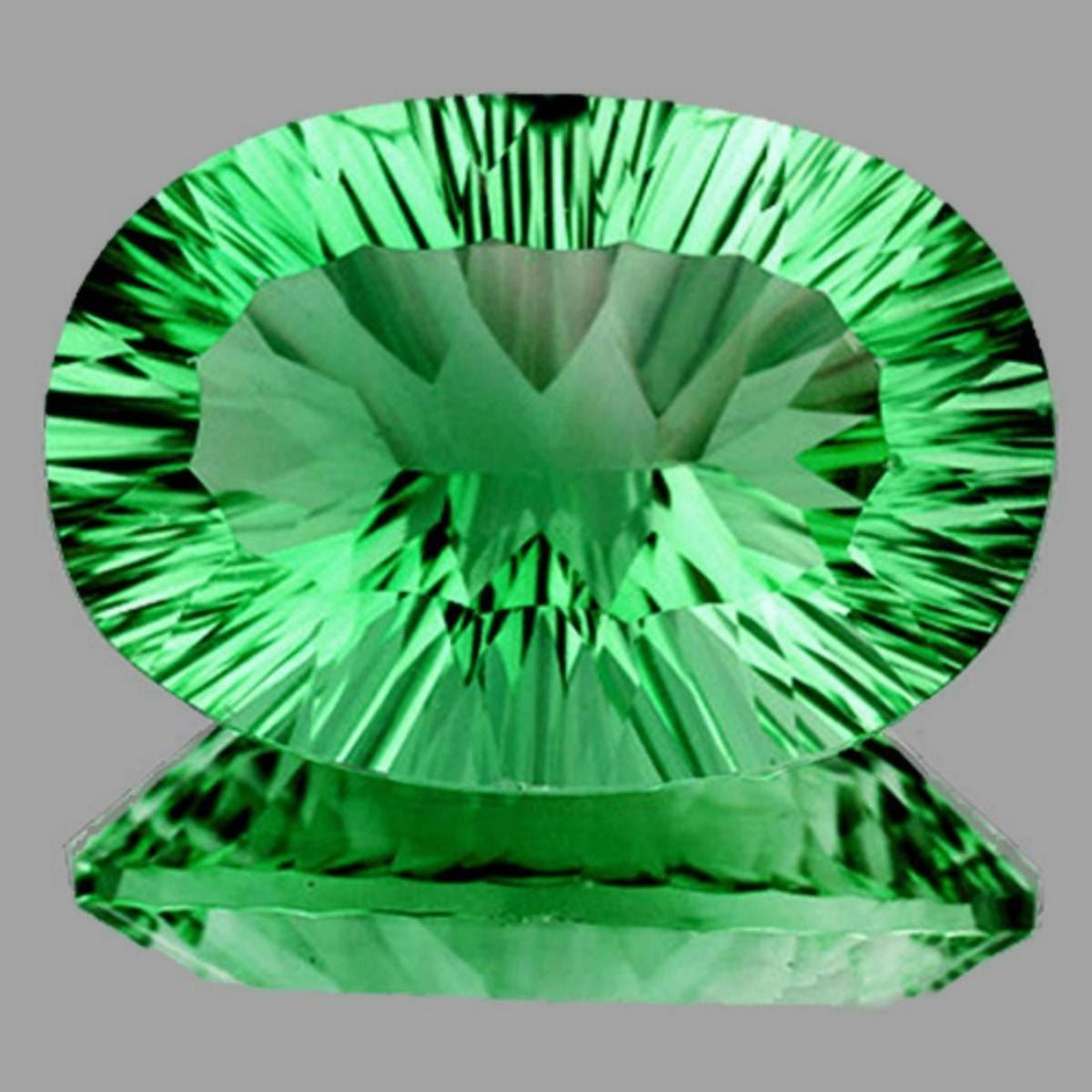 Natural Fluorite WEIGHT : 39.72 cts; SHAPE : Oval (Concave Cut); SIZE ( L x W x D ) : 25.87 x 18.37 x 13.10 mm; QUANTITY : 1 piece ; COLOR : Paraiba Green AAA Color; CLARITY : Flawless-VVS1 AAA Grade ORIGIN : Brazil; HARDNESS : 4-5; LUSTER : Excellent!!!; TREATMENT : 100% Natural Unheated;
