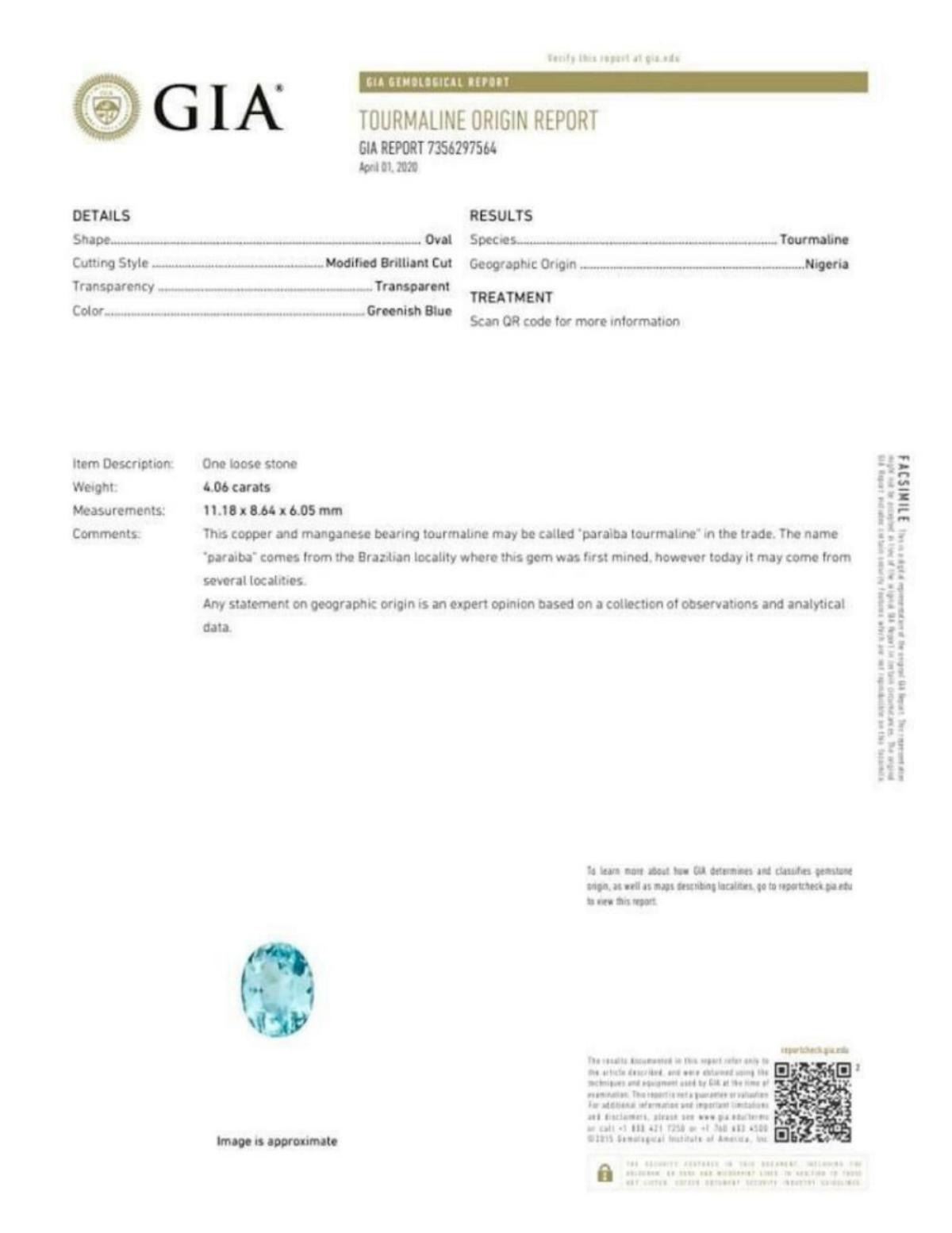 Natural Paraiba Tourmaline 4.06 Cts (VVS) - GIA......size - 11.18 x 8.64 x 6.05 MM; VVS Clarity; Paraiba Tourmaline is a very rare variety of Tourmaline prized for its Blue( Blue Green Colors). It was traditionally mined from Brazil, but today we have different deposit from Nigeria and Mozambique. Origin of this stone is Nigeria.