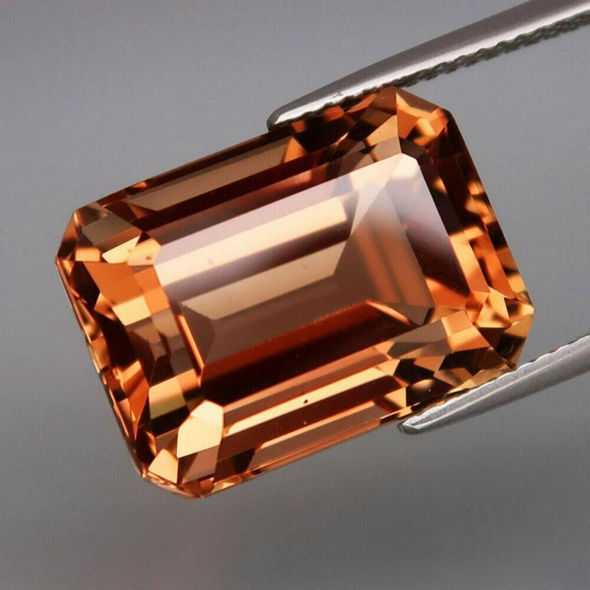 Imperial Topaz SHAPE Emerald Cut WEIGHT 20.86 Ct.SIZE 16.5 X 12.2 X 10.2 mm QUANTITY 1 Piece; COLOR Peach Champagne; CLARITY ORIGIN Brazil TREATMENT Radiated HARDNESS 8