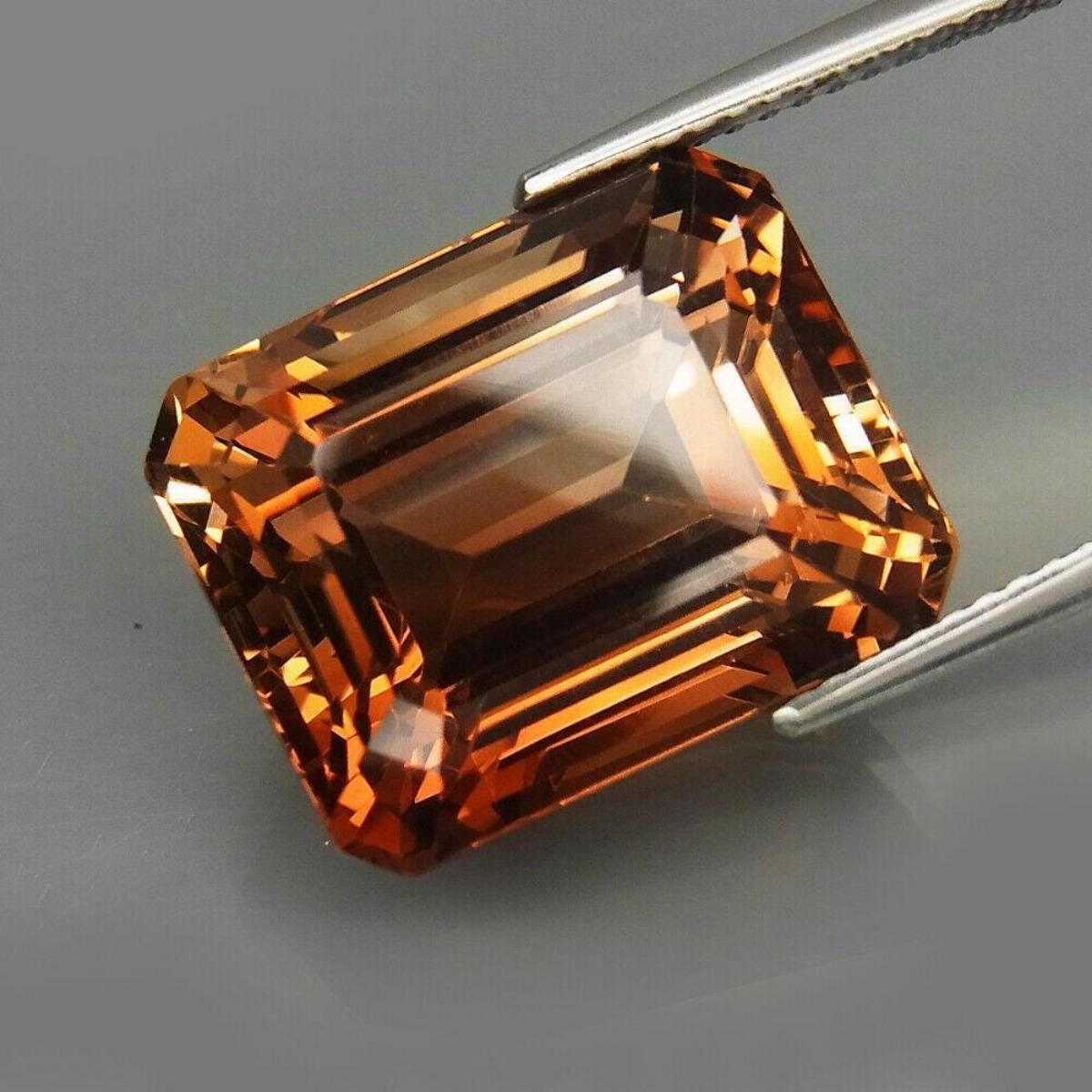 Imperial Topaz SHAPE Emerald Cut WEIGHT 21.04 Ct.SIZE 15.8 X 12.8 X 10.3 mm QUANTITY 1 Piece COLOR Peach Champagne CLARITY CLEAN LUSTER Superior ORIGIN Brazil TREATMENT Radiated HARDNESS 8