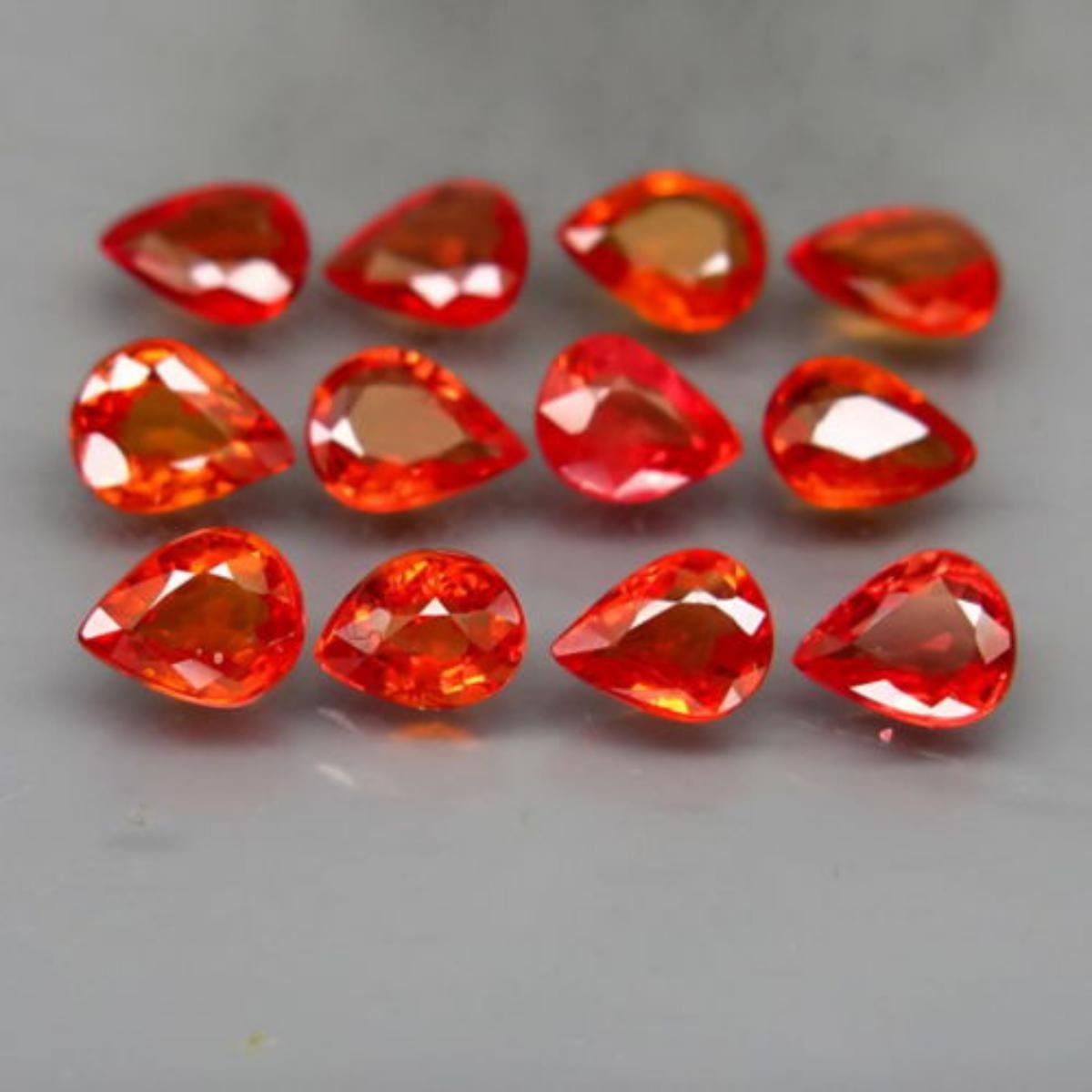 Natural Sapphire.........SHAPE :Pear Shape;WEIGHT :4.20 Ct.;SIZE :5 X 4 Mm.;QUANTITY :12 Pieces;COLOR :Orange;CLARITY :Vs Si;LUSTER :Superior;ORIGIN :Africa;TREATMENT :Heated;HARDNESS :9