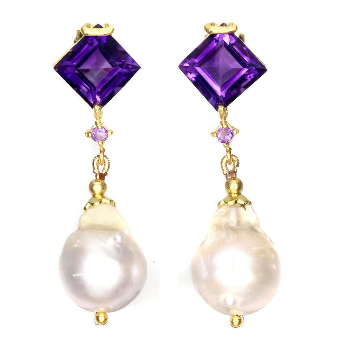 925 STERLING SILVER;PLATE...14K YELLOW GOLD;MAIN STONE-AMETHYST;OTHER GEMS-PEARL;TOTAL WEIGHT-80.46 CT (TOTAL WEIGHT OF SILVER + STONE)DIMENSION* STONE 2.5 TO 10.0 MM. * PEARL 18.0 X 14.0 MM. * FACE EARRINGS 50.0 X 15.0 MM.MAIN STONE SHAPE-SQUARE CUT;MAIN STONE COLOR-TOP INTENSE PURPLE;CLARITY/GRADE-IF TO VVS;LUSTER-EXQUISITE;TREATMENT-UNHEATED;HARDNESS-2.5 - 7.0-