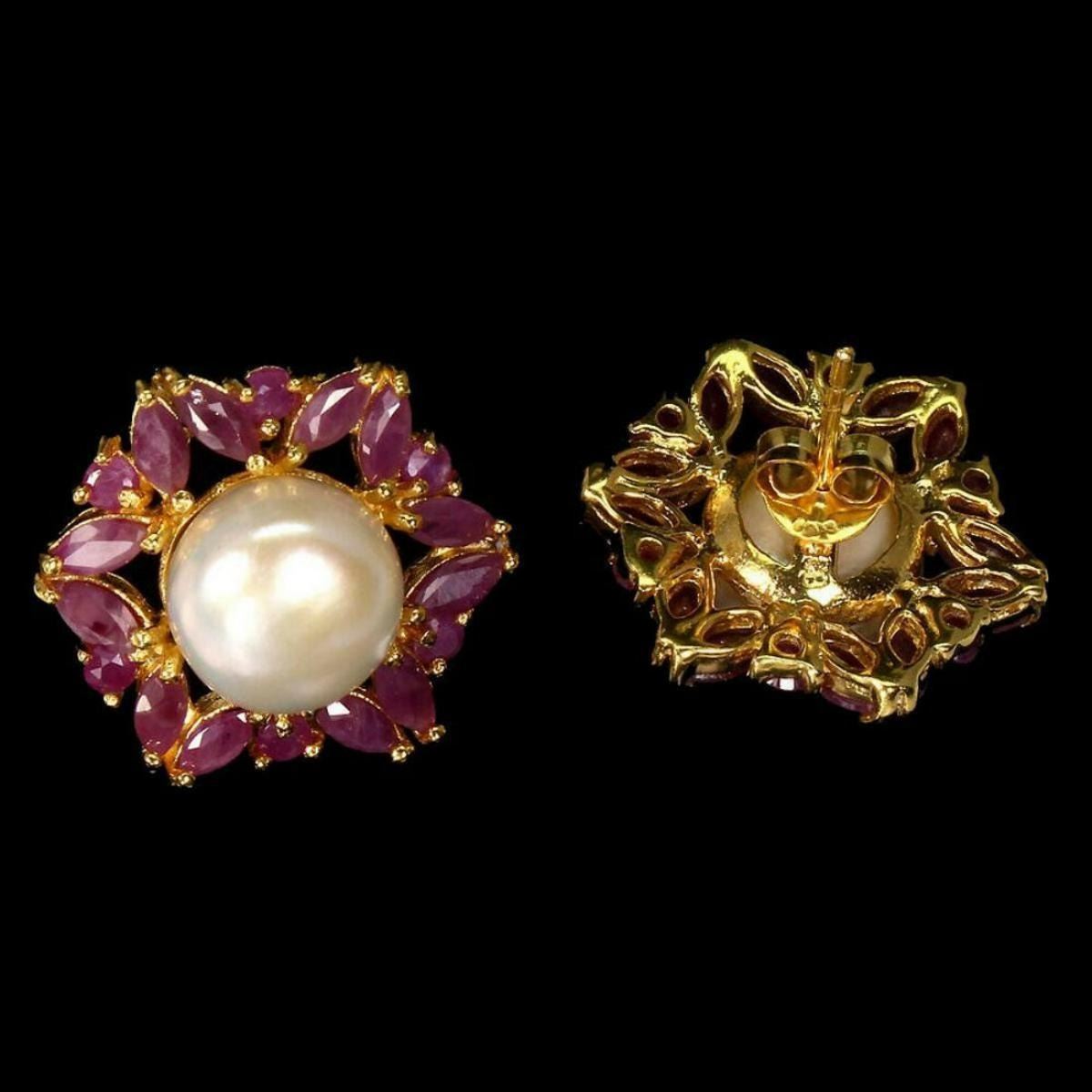 925 STERLING SILVER;PLATE-14K YELLOW GOLD;MAIN STONE-RUBY;OTHER GEMS-PEARL;TOTAL WEIGHT-10.12 GRAM (TOTAL WEIGHT OF SILVER + STONE)DIMENSION* STONE 2.5 TO 5.0 X 2.5 MM. * PEARL 11.0 MM. * FACE EARRINGS 23.0 X 20.0 MM.;MAIN STONE SHAPE-MARQUISE CUT;MAIN STONE COLOR-TOP RICH RED PINK;ORIGIN- Mozambique & Japan;HARDNESS2.5 - 9.0;