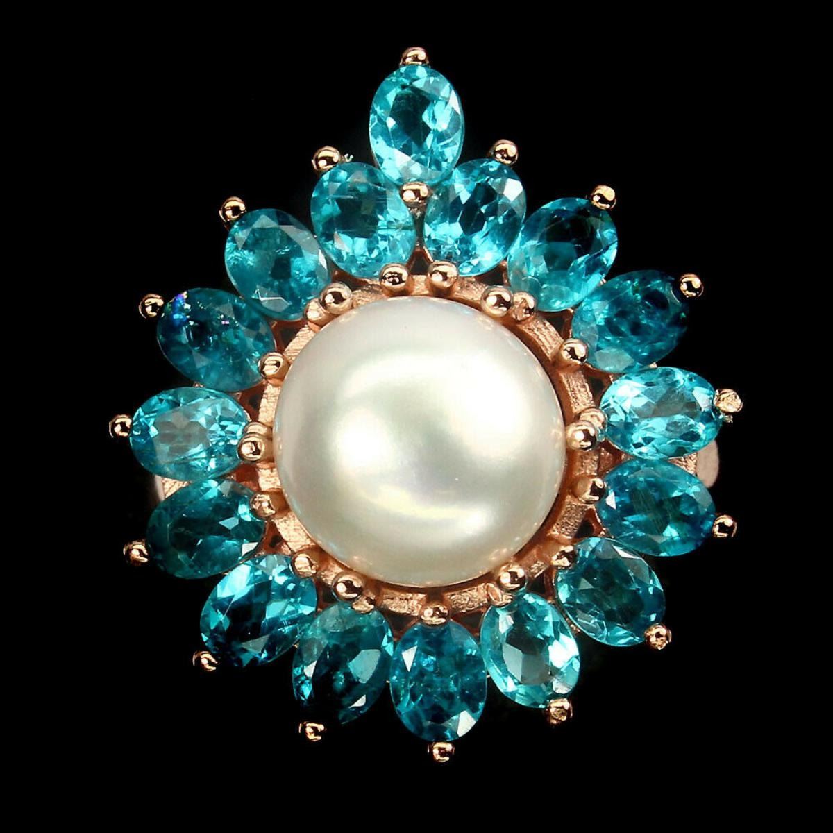 925 STERLING SILVER;PLATE...14K ROSE GOLD;RING SIZE-7(resizeable)MAIN STONE-APATITE;OTHER GEMS-PEARL;TOTAL WEIGHT-30.46 CT (TOTAL WEIGHT OF SILVER + STONE)DIMENSION* STONE 4.0 X 3.0 MM. * PEARL 10.0 MM. * RING SIZE 7.0 * FACE RING 24.0 X 21.0 MM.;MAIN STONE SHAPE-OVAL CUT;MAIN STONE COLOR-TOP PARAIBA BLUE;CLARITY/GRADE-IF TO VVS;ORIGIN-AFRICA