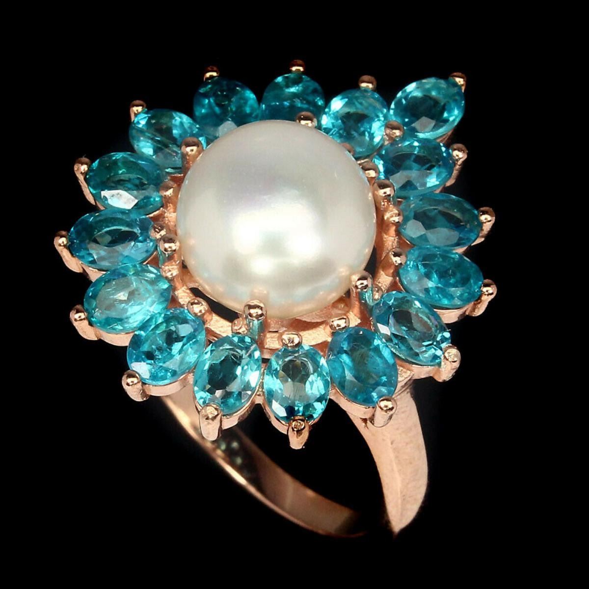 925 STERLING SILVER;PLATE...14K ROSE GOLD;RING SIZE-7(resizeable)MAIN STONE-APATITE;OTHER GEMS-PEARL;TOTAL WEIGHT-30.46 CT (TOTAL WEIGHT OF SILVER + STONE)DIMENSION* STONE 4.0 X 3.0 MM. * PEARL 10.0 MM. * RING SIZE 7.0 * FACE RING 24.0 X 21.0 MM.;MAIN STONE SHAPE-OVAL CUT;MAIN STONE COLOR-TOP PARAIBA BLUE;CLARITY/GRADE-IF TO VVS;ORIGIN-AFRICA