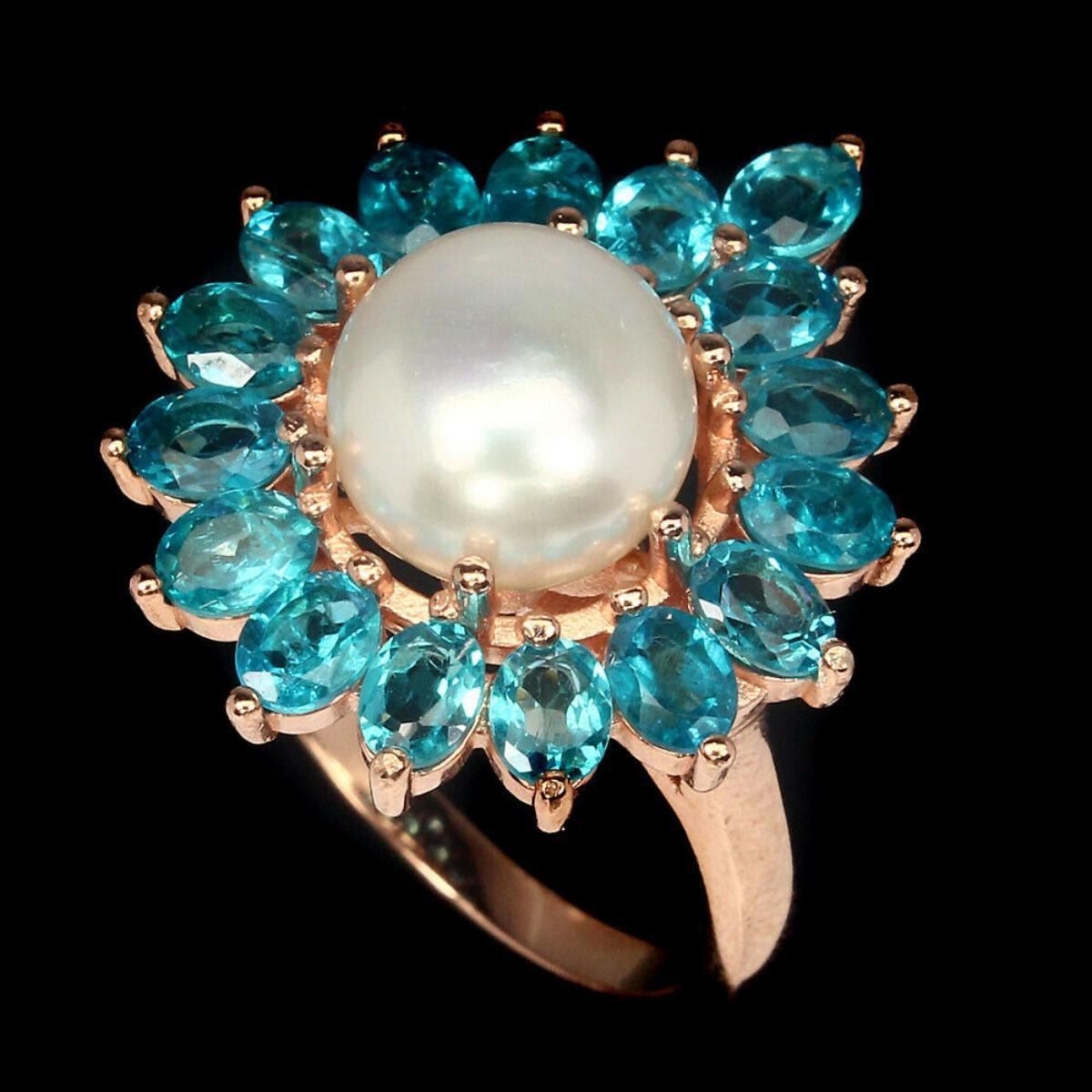 925 STERLING SILVER;PLATE...14K ROSE GOLD;RING SIZE-7(resizeable)MAIN STONE-APATITE;OTHER GEMS-PEARL;TOTAL WEIGHT-30.46 CT (TOTAL WEIGHT OF SILVER + STONE)DIMENSION* STONE 4.0 X 3.0 MM. * PEARL 10.0 MM. * RING SIZE 7.0 * FACE RING 24.0 X 21.0 MM.;MAIN STONE SHAPE-OVAL CUT;MAIN STONE COLOR-TOP PARAIBA BLUE;CLARITY/GRADE-IF TO VVS;ORIGIN-AFRICA