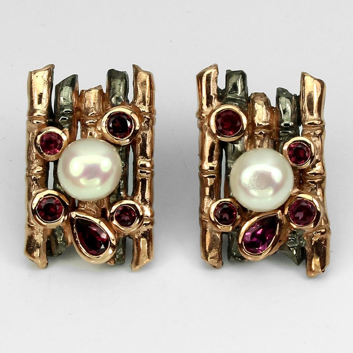 925 STERLING SILVER;PLATE-2-TONE BLACK RHODIUM 14K ROSE GOLDRING SIZE/LENGTH (INCHES)MAIN STONEPEARLOTHER GEMSRHODOLITE GARNETTOTAL WEIGHT42.09 CT (TOTAL WEIGHT OF SILVER + STONE)DIMENSION* STONE 2.5 TO 5.0 X 3.0 MM. * PEARL 7.0 MM. * FACE EARRINGS 23.0 X 14.0 MM.MAIN STONE SHAPE-ROUND BUTTON;MAIN STONE COLOR-CREAMY WHITE;TREATMENT - FRESHWATERHARDNESS2.5 - 7.5