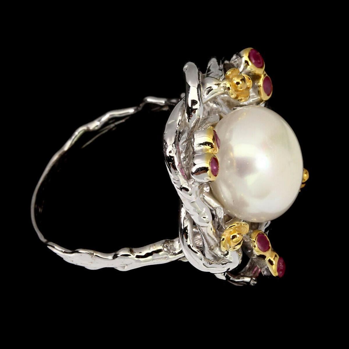 925 STERLING SILVER;PLATE-2-TONE WHITE & YELLOW 14K GOLD;RING SIZE-8(Resizeable)MAIN STONE-RUBY;OTHER GEMS-PEARL;TOTAL WEIGHT-37.71 CT (TOTAL WEIGHT OF SILVER + STONE)DIMENSION* STONE 2.0 MM. * PEARL 11.0 MM. * RING SIZE 8.0 * FACE RING 22.0 MM.;MAIN STONE SHAPE-ROUND CUT;MAIN STONE COLOR-TOP RICH RED PINK;CLARITY/GRADE-TRANSPARENT;ORIGIN-Japan , AFRICA;HARDNESS-2.5 - 9.0;