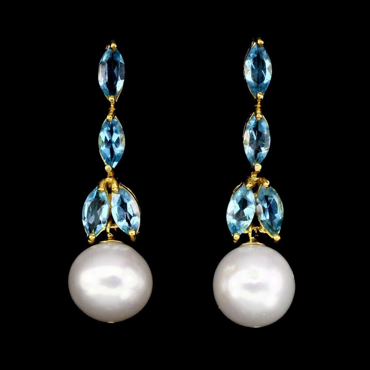 925 STERLING SILVER;PLATE--14K YELLOW GOLD;MAIN STONE-SWISS BLUE TOPAZ;OTHER GEMS-PEARL;TOTAL WEIGHT-48.69 CT (TOTAL WEIGHT OF SILVER + STONE)DIMENSION* STONE 8.0 X 4.0 MM. * PEARL 13.5 MM. * FACE EARRINGS 42.0 X 11.0 MM.;MAIN STONE SHAPE-MARQUISE CUT;MAIN STONE COLOR-TOP SWISS BLUE;CLARITY/GRADE-IF TO VVS;ORIGIN-AFRICA;HARDNESS-8;