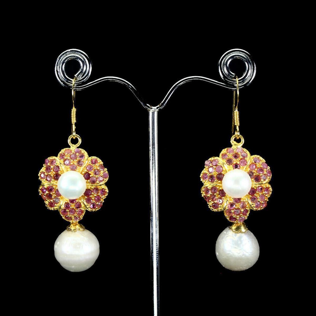 925 STERLING SILVER;PLATE...14K YELLOW GOLD;MAIN STONE-RUBY;OTHER GEMS-PEARL;TOTAL WEIGHT-71.56 CT (TOTAL WEIGHT OF SILVER + STONE)DIMENSION* STONE 2.0 MM. * PEARL 8.0 TO 12.0 MM. * FACE EARRINGS 53.0 X 19.0 MM.;MAIN STONE SHAPEROUND CUT;MAIN STONE COLORTOP RICH RED PINK;TREATMENT- None;ORIGIN-AFRICA;HARDNESS-2.5 - 9.0