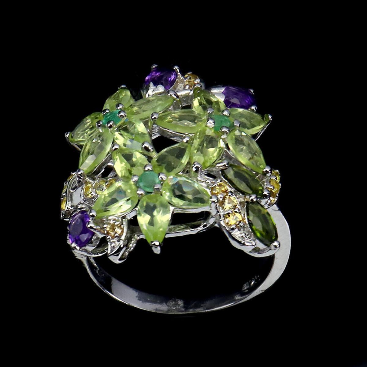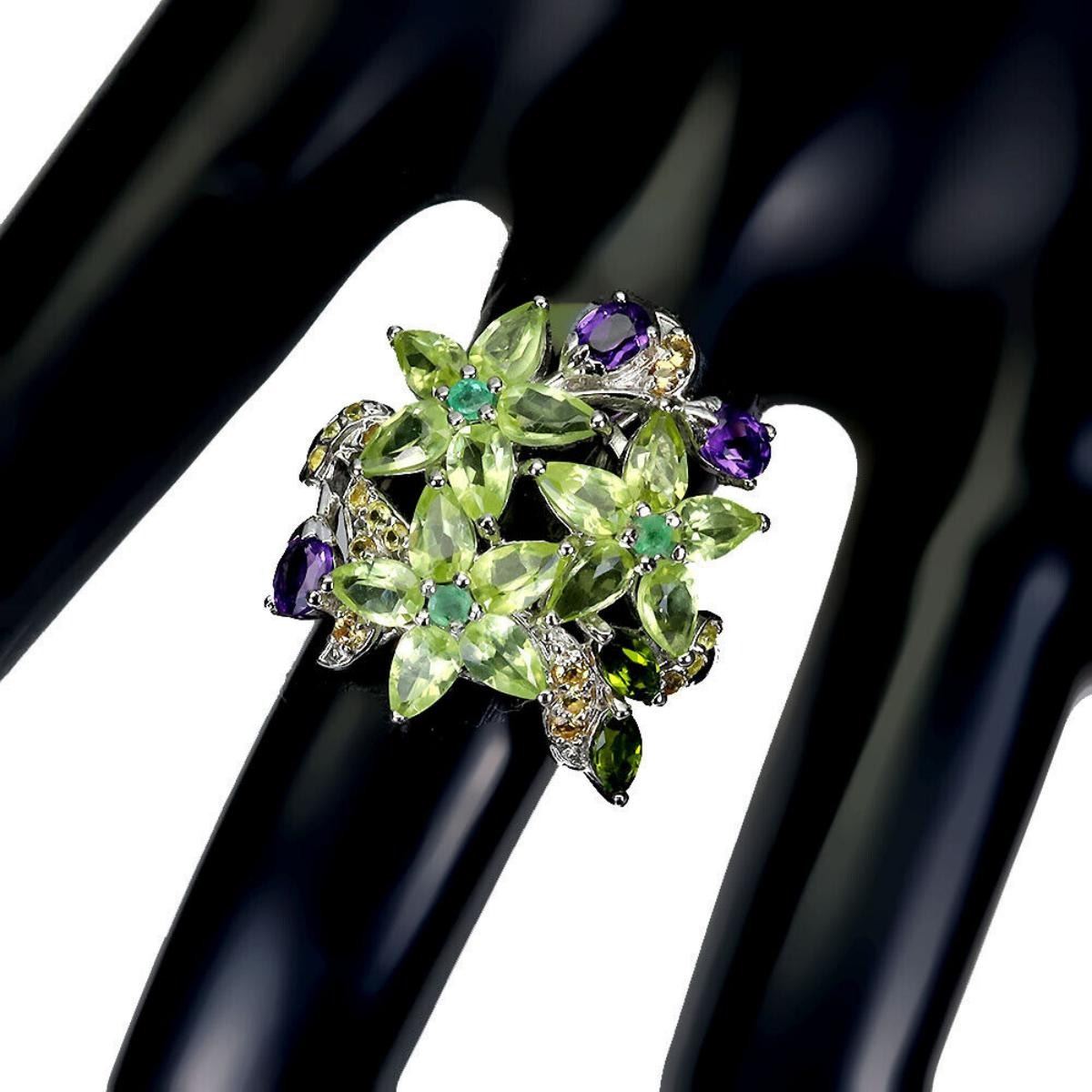 925 STERLING SILVER;PLATE-14K WHITE GOLD;RING SIZE/resizable-8;MAIN STONE-PERIDOT;OTHER GEMS-AMETHYST, CHROME DIOPSIDE, EMERALD, SAPPHIRE;TOTAL WEIGHT-5.48 GRAM (TOTAL WEIGHT OF SILVER + STONE);DIMENSION-* STONE 1.5 TO 5.0 X 3.0 MM.;* FACE RING- 23.0 X 21.0 MM.;MAIN STONE SHAPE-OVAL CUT;MAIN STONE COLOR-TOP RICH GREEN;TREATMENT-UNHEATED;ORIGIN-PAKISTAN;